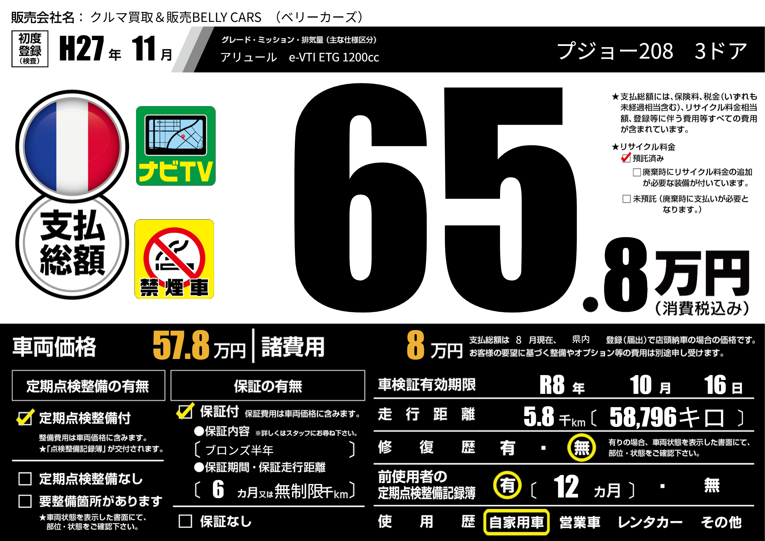 | 車名 | プジョー208 3ドア | グレード ミッション 排気量 |