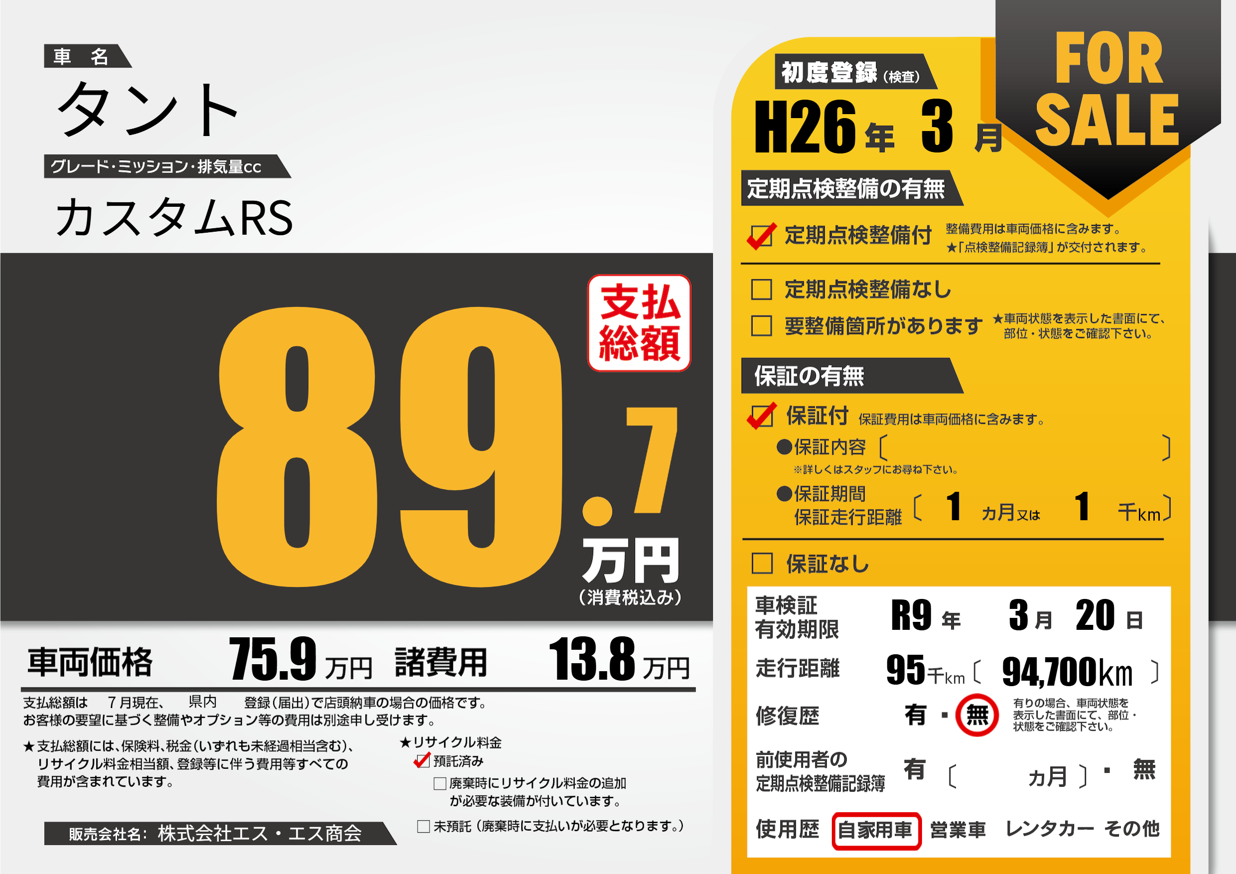 | 走行キロ | 9.5万km | 初年度登録 | H26年3月 |