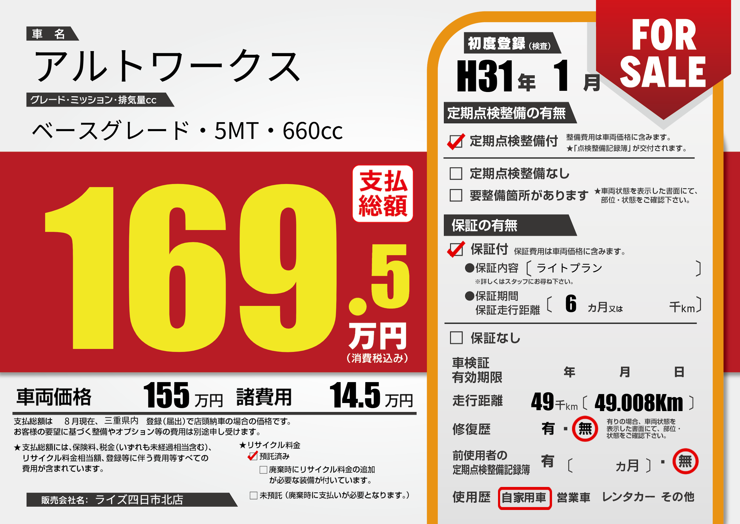 | 車名 | アルトワークス | グレード ミッション 排気量 |