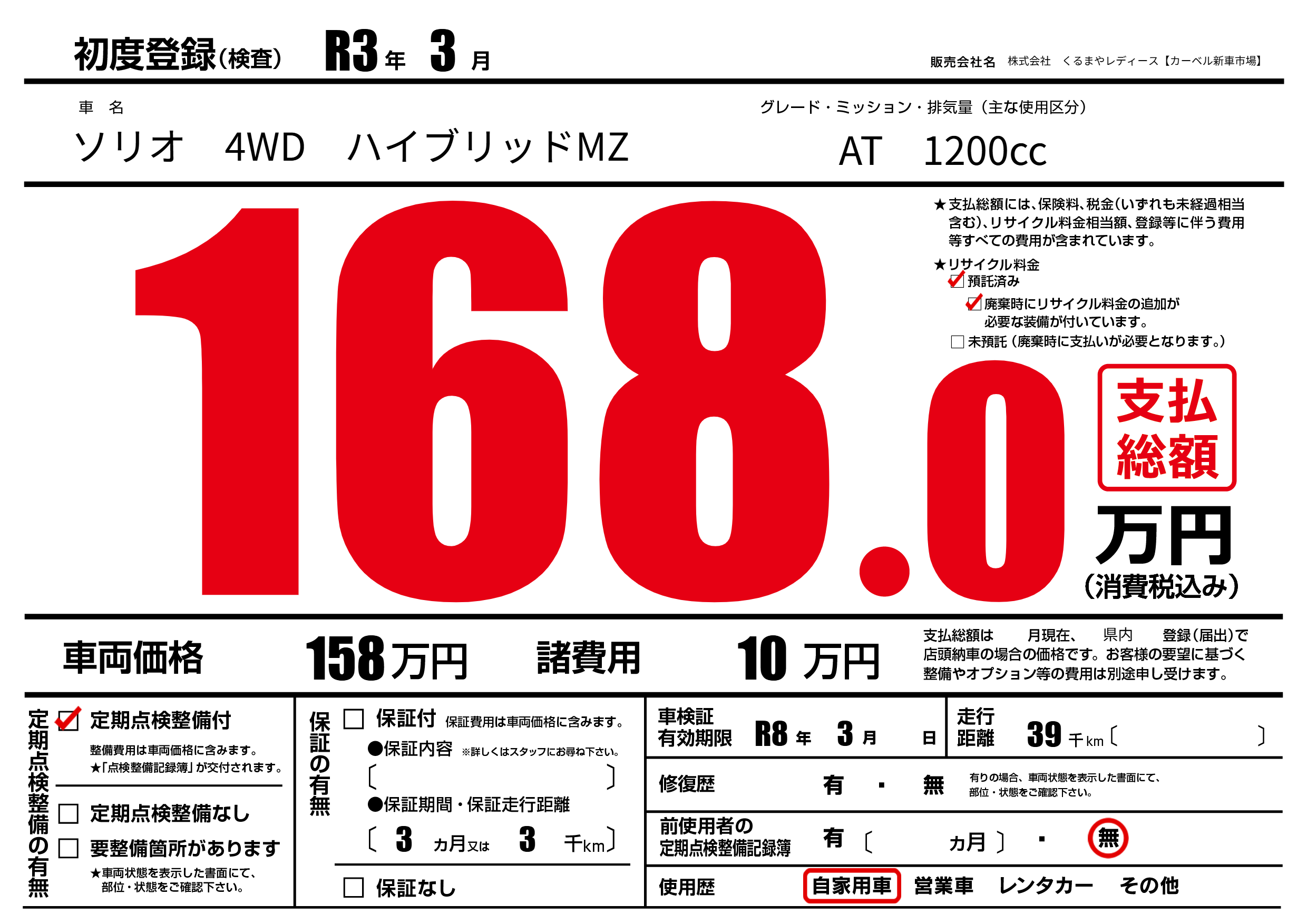 | 走行キロ | 3.9万km | 初年度登録 | R3年3月 |