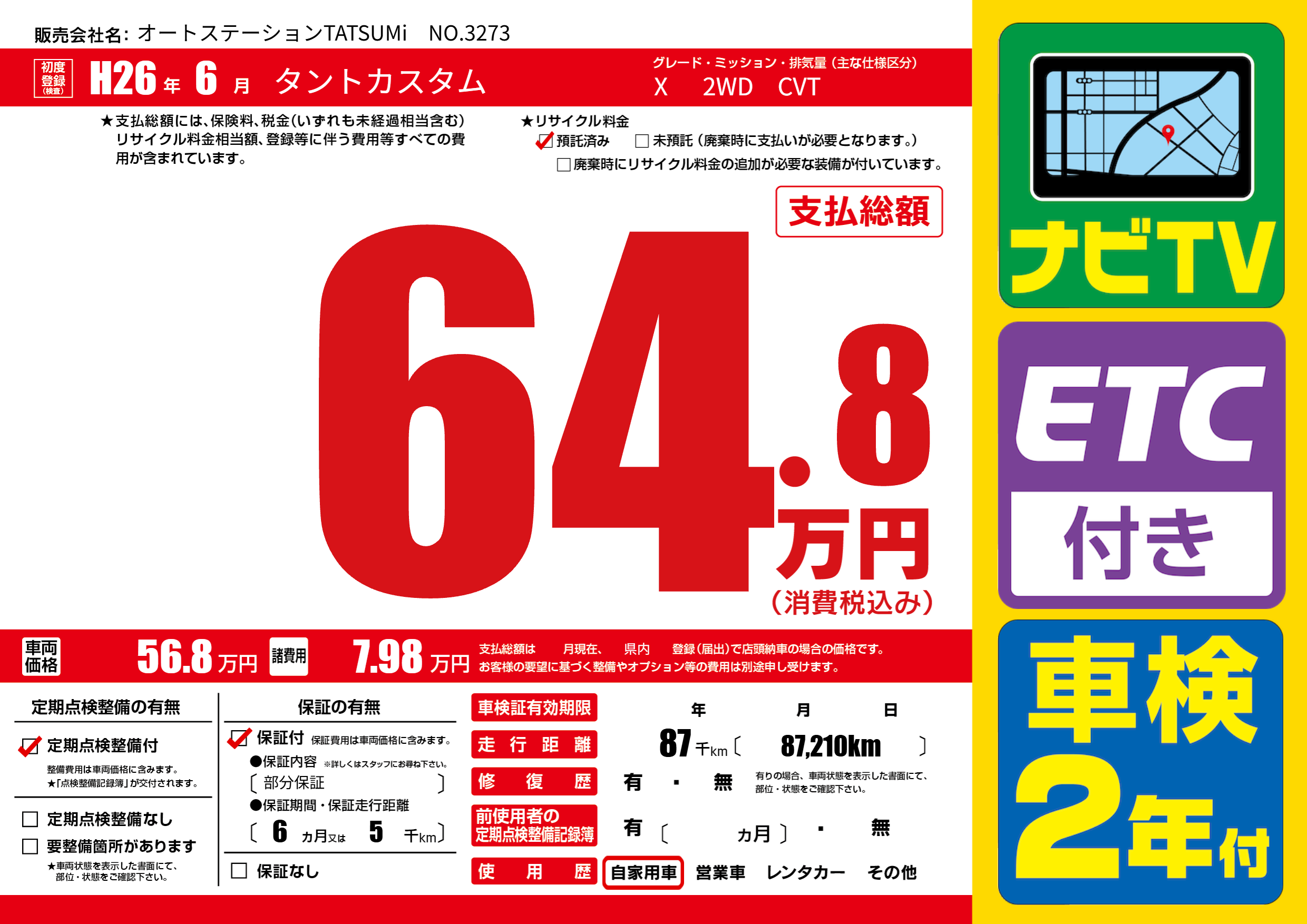 | 車名 | タントカスタム | グレード ミッション 排気量 |