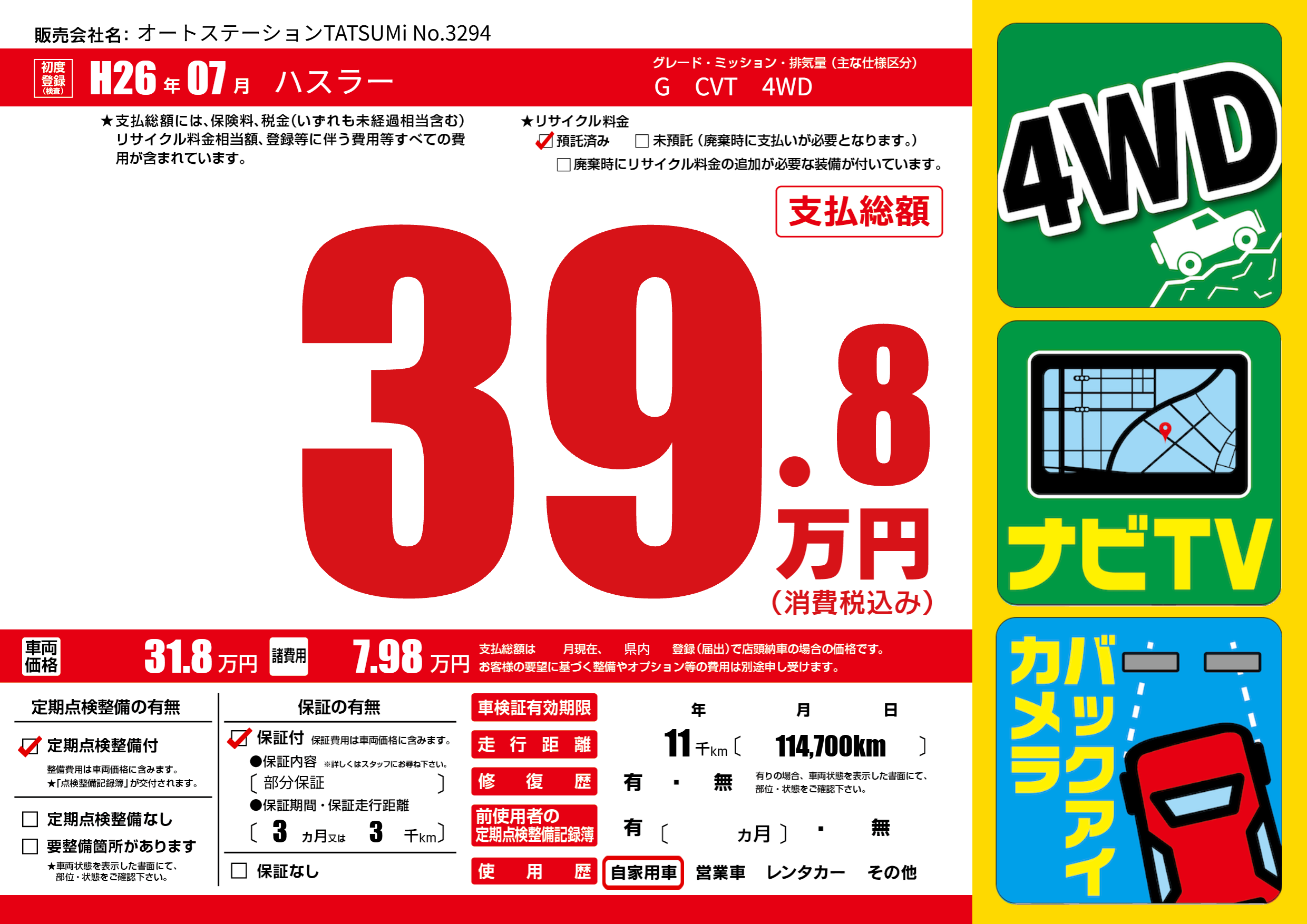 | 車名 | ハスラー | グレード ミッション 排気量 |