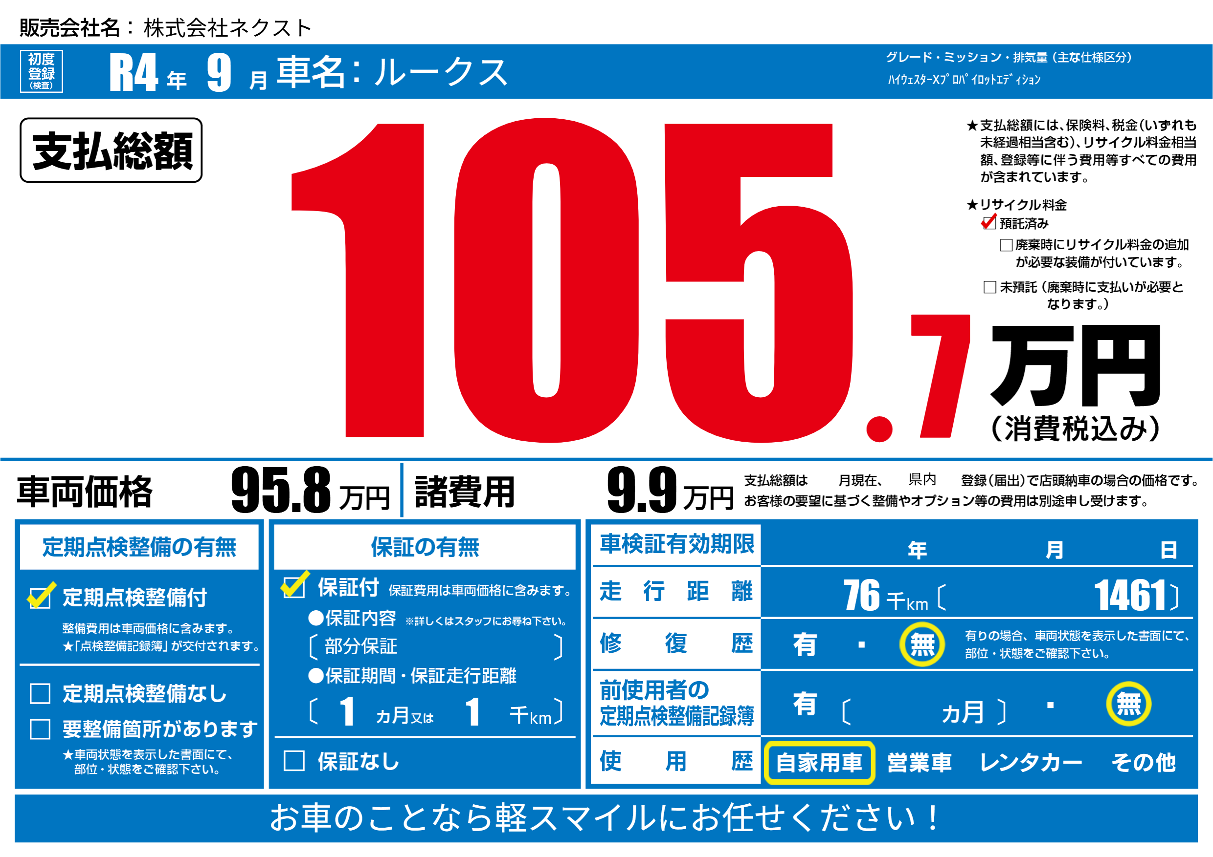 | 走行キロ | 7.6万km | 初年度登録 | R4年9月 |