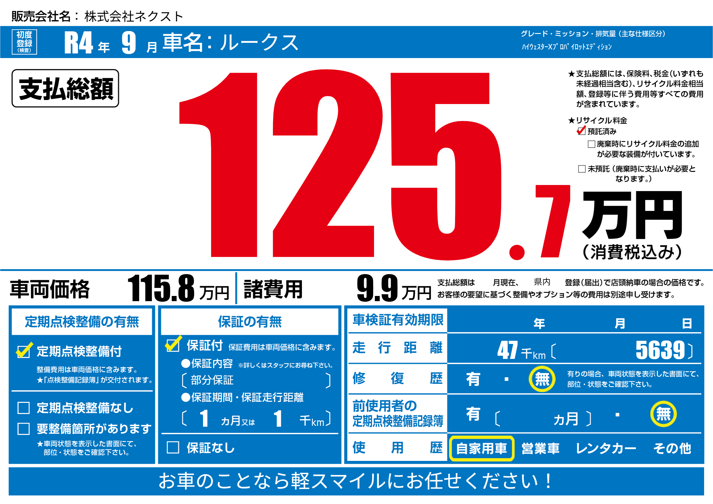 | 走行キロ | 4.7万km | 初年度登録 | R4年9月 |