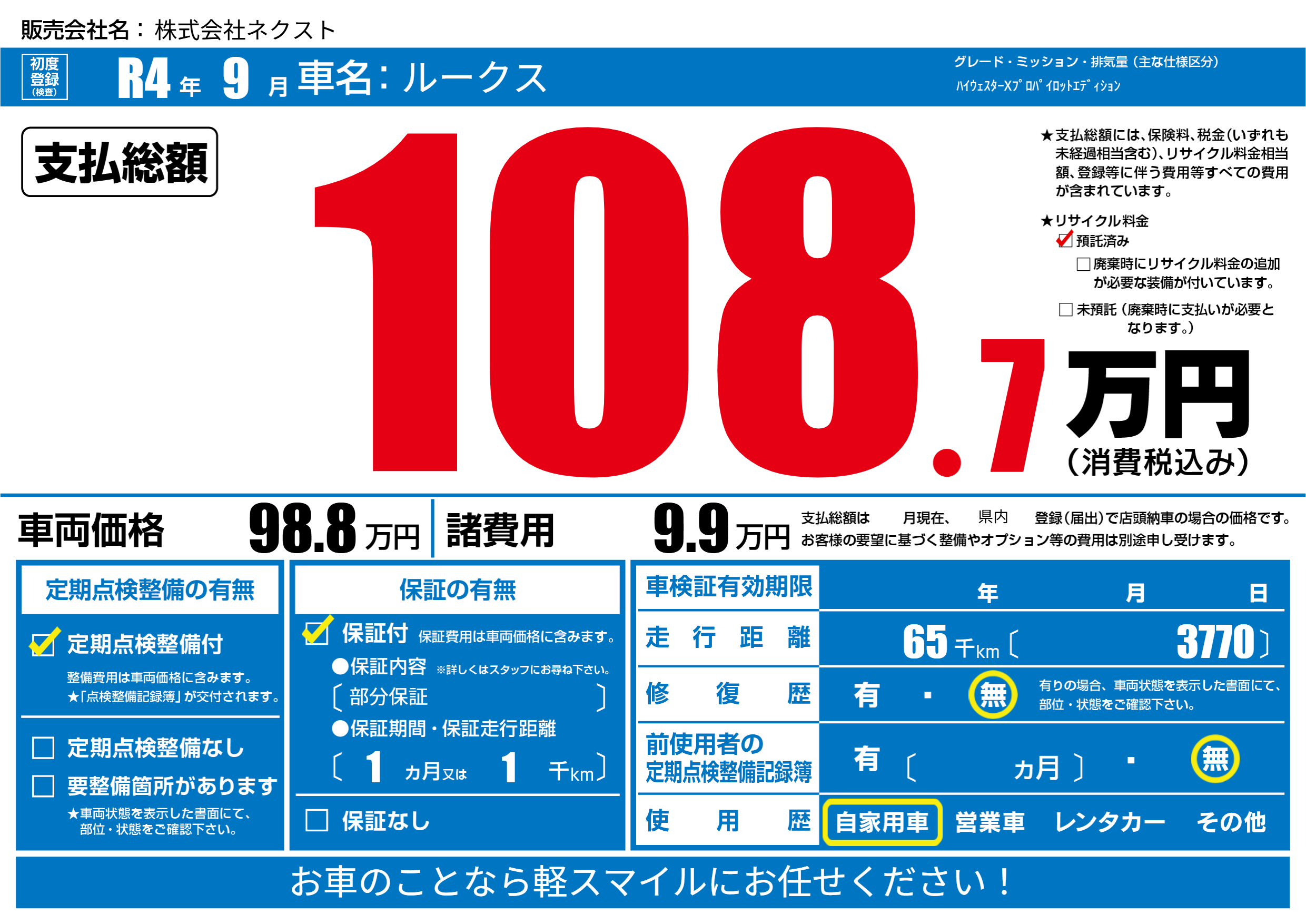 | 走行キロ | 6.5万km | 初年度登録 | R4年9月 |
