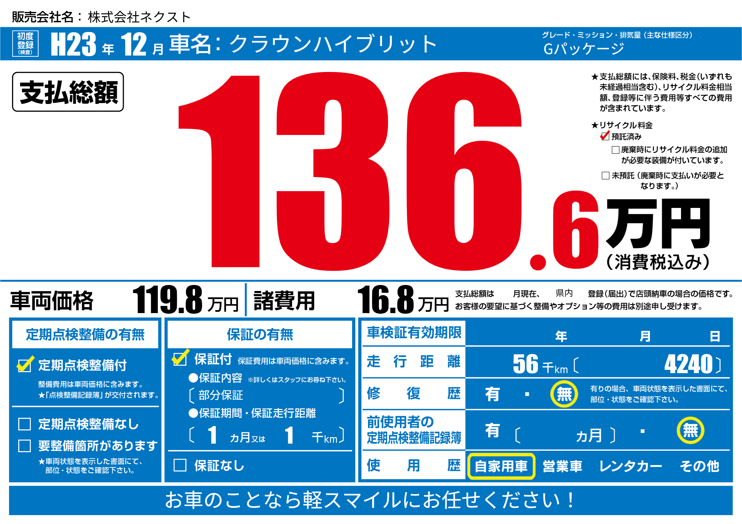 | 走行キロ | 5.6万km | 初年度登録 | H23年12月 |