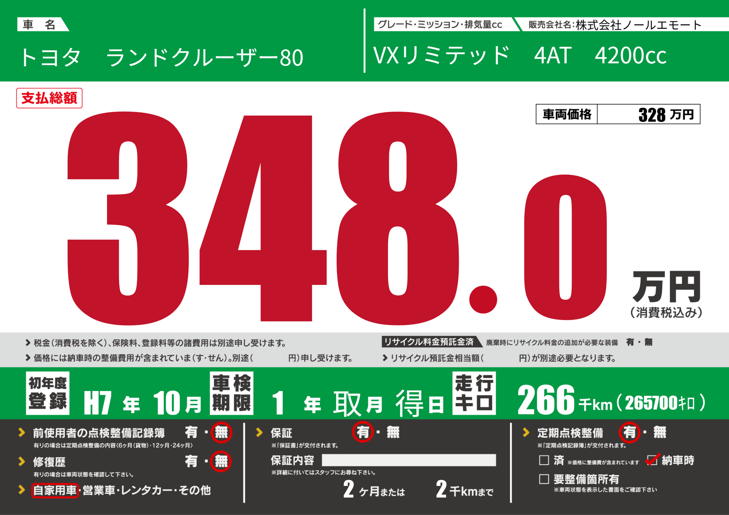 | 走行キロ | 26.6万km | 初年度登録 | H7年10月 |