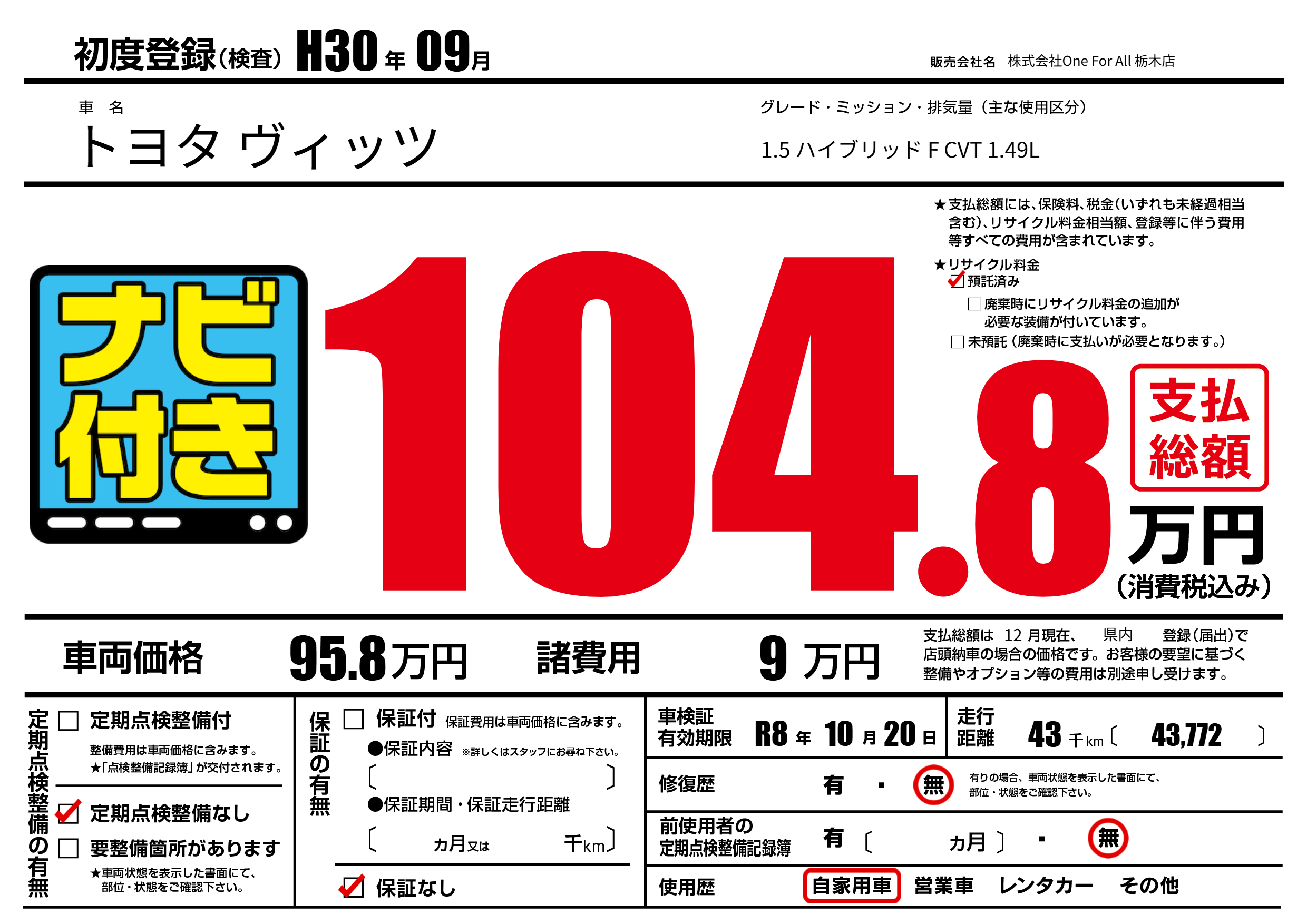 なし | 車検制限 | R8年10月20月 |