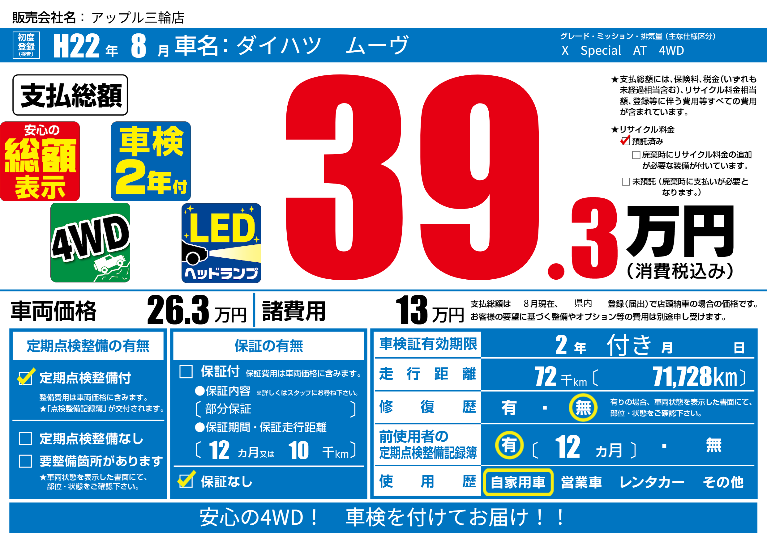 | 走行キロ | 7.2万km | 初年度登録 | H22年8月 |