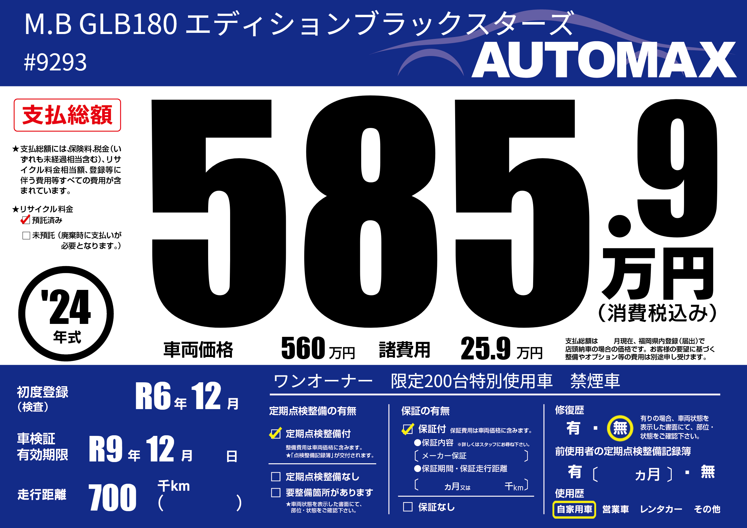 | 車名 | M.B GLB180 エディションブラックスターズ | グレード ミッション 排気量 |