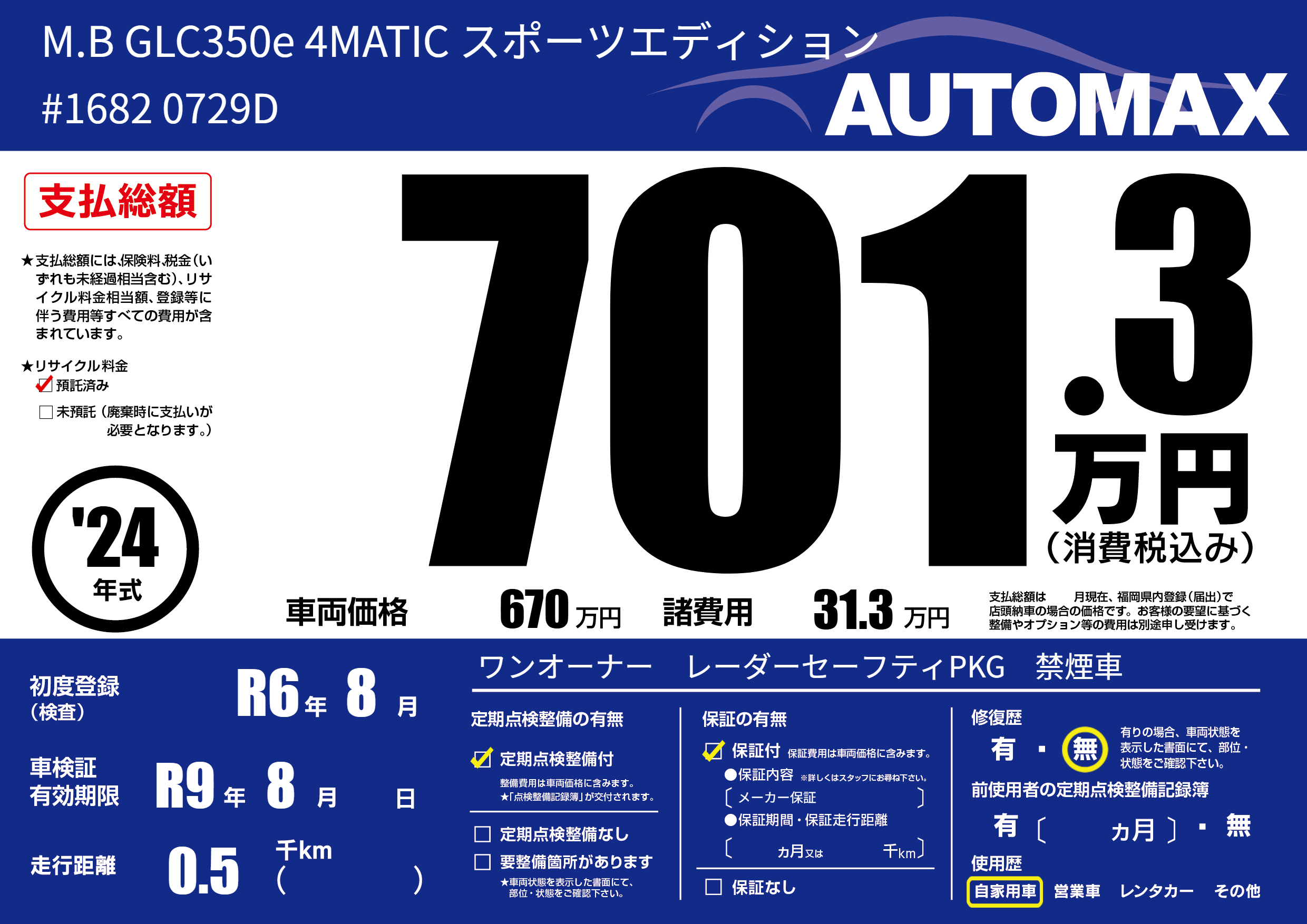 | 走行キロ | - | 初年度登録 | R6年8月 |