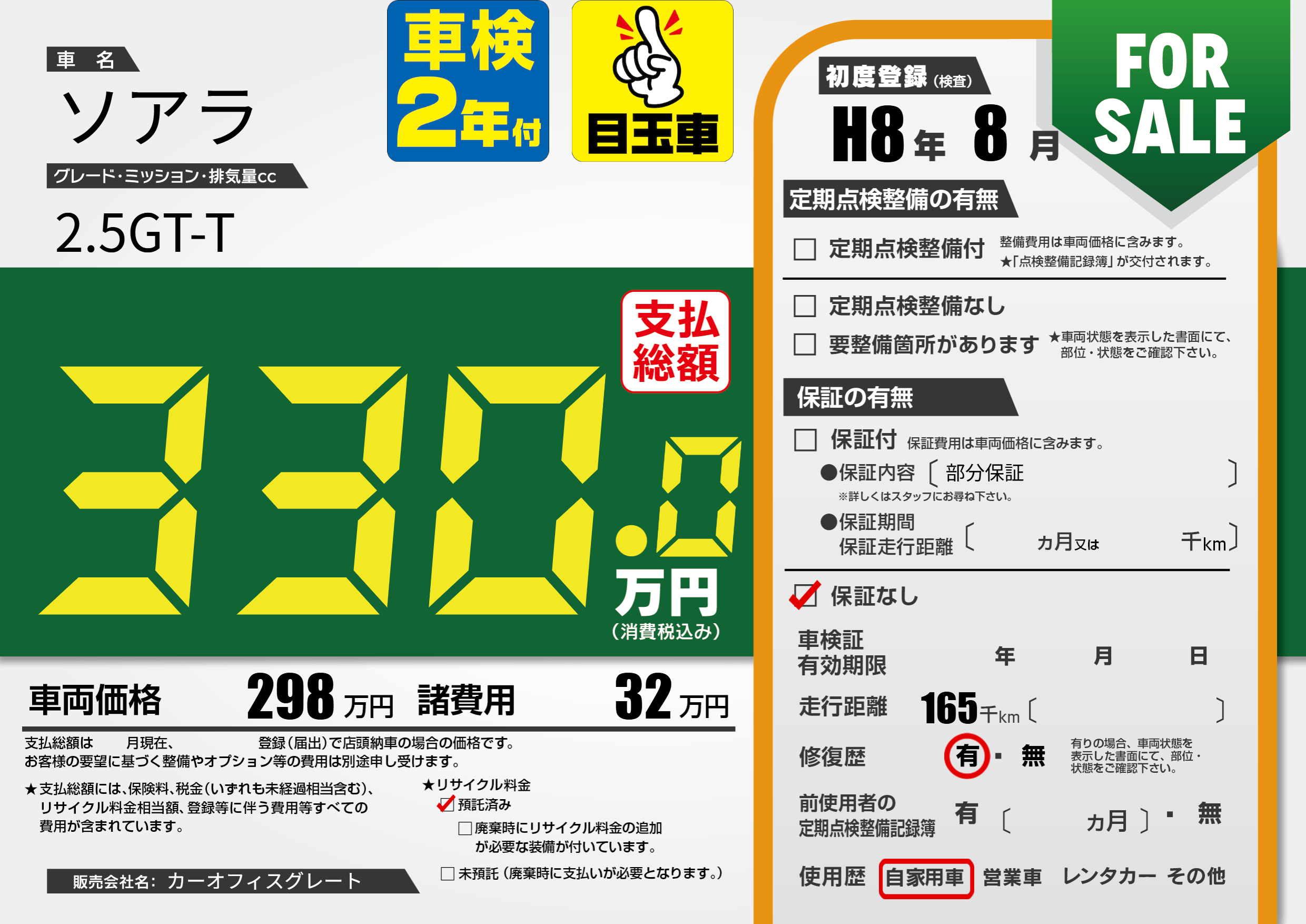 保証なし 保証内容(部分保証) ---ヶ月または()千kmまで |