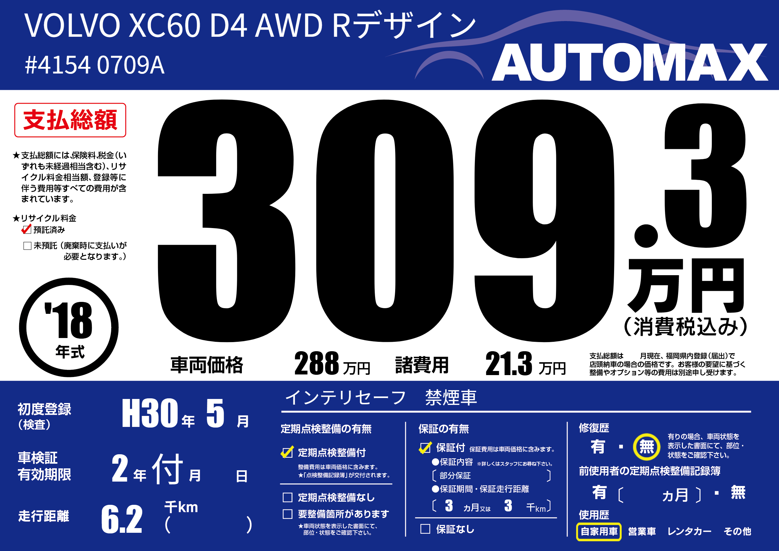 | 車名 | VOLVO XC60 D4 AWD Rデザイン | グレード ミッション 排気量 |