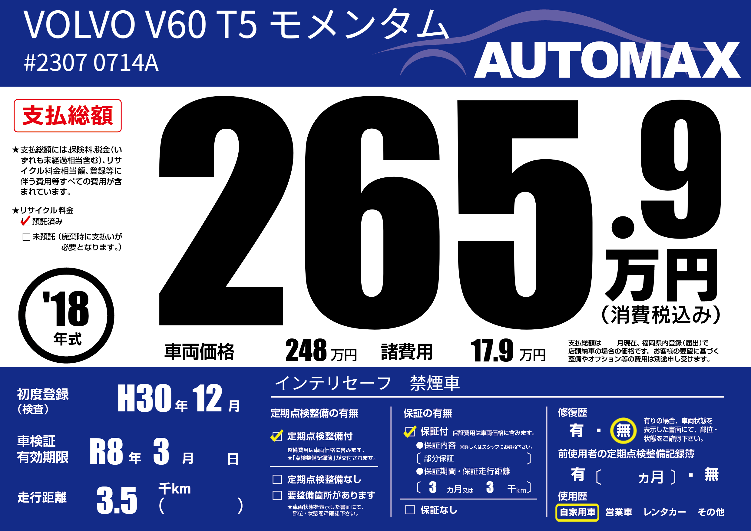 | 車名 | VOLVO V60 T5 モメンタム | グレード ミッション 排気量 |