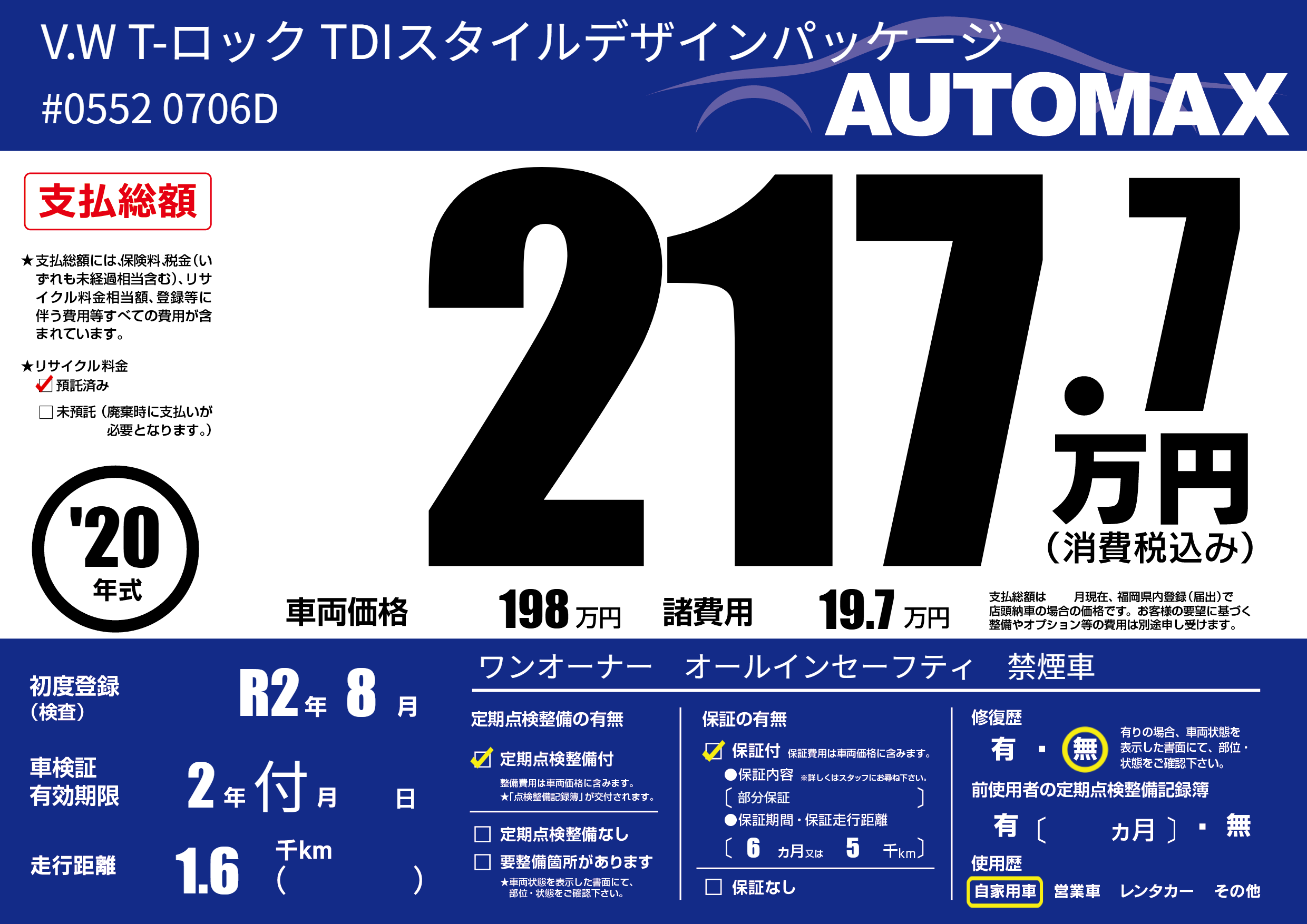 | 車名 | V.W T-ロック TDIスタイルデザインパッケージ | グレード ミッション 排気量 |