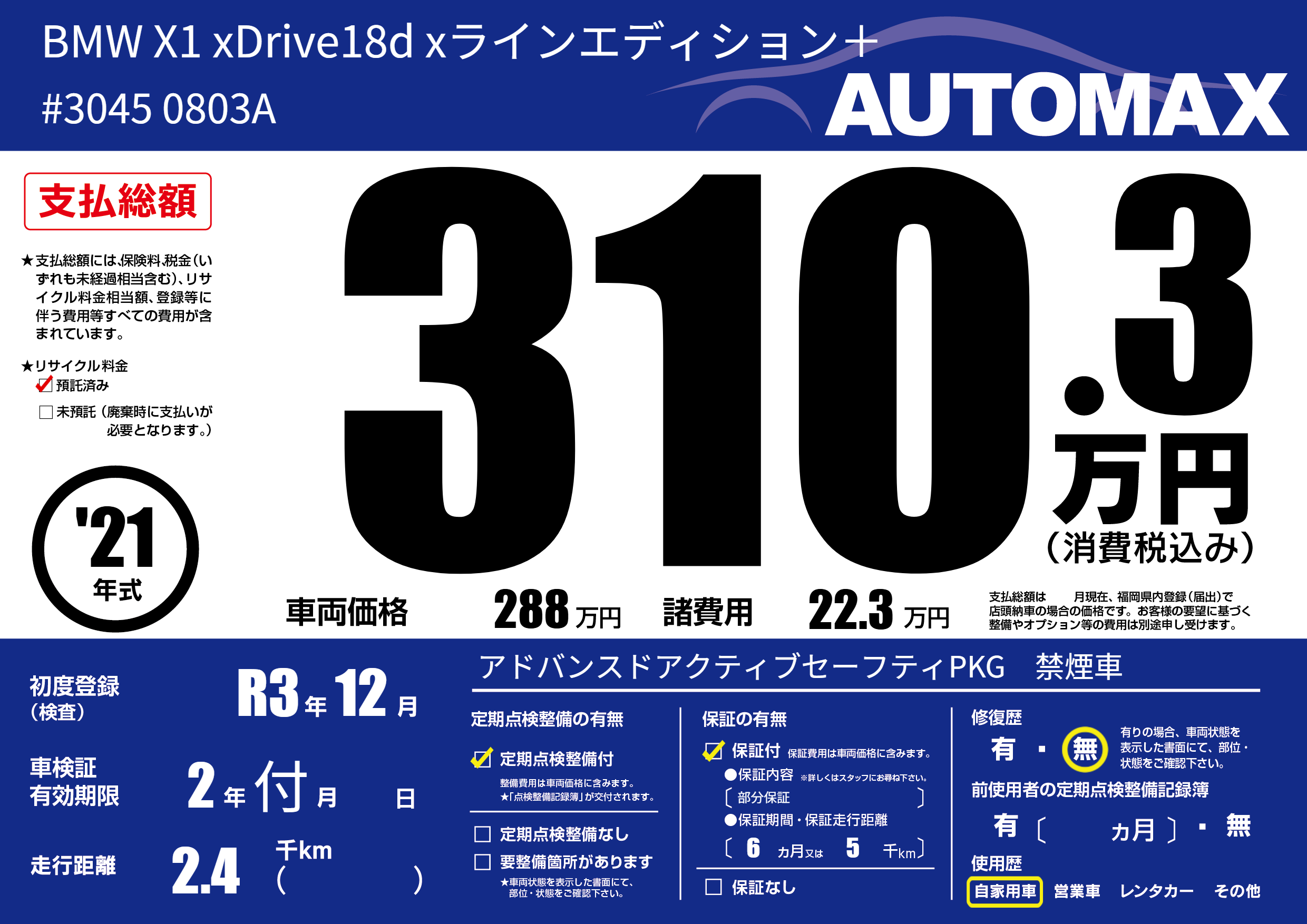 | 車名 | BMW X1 xDrive18d xラインエディション+ | グレード ミッション 排気量 |