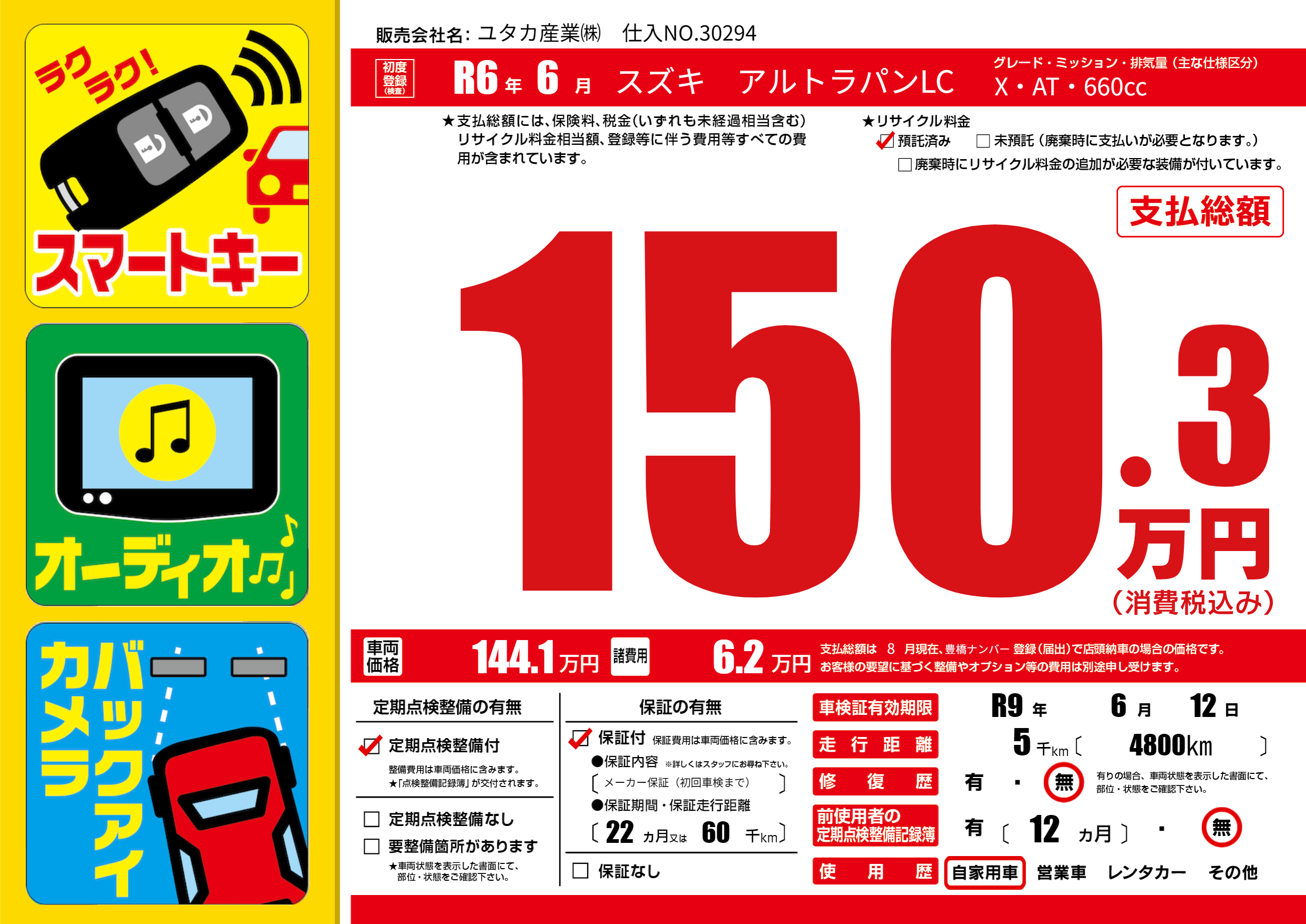 | 走行キロ | 0.5万km | 初年度登録 | R6年6月 |