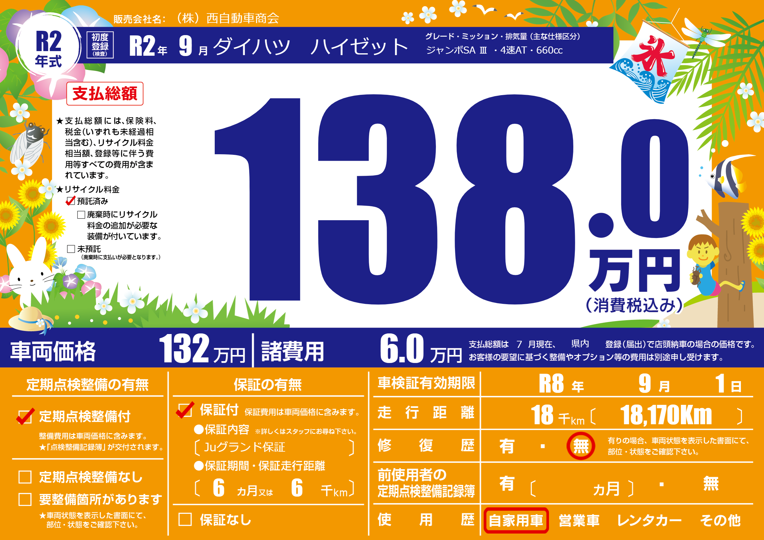 | 走行キロ | 1.8万km | 初年度登録 | R2年9月 |