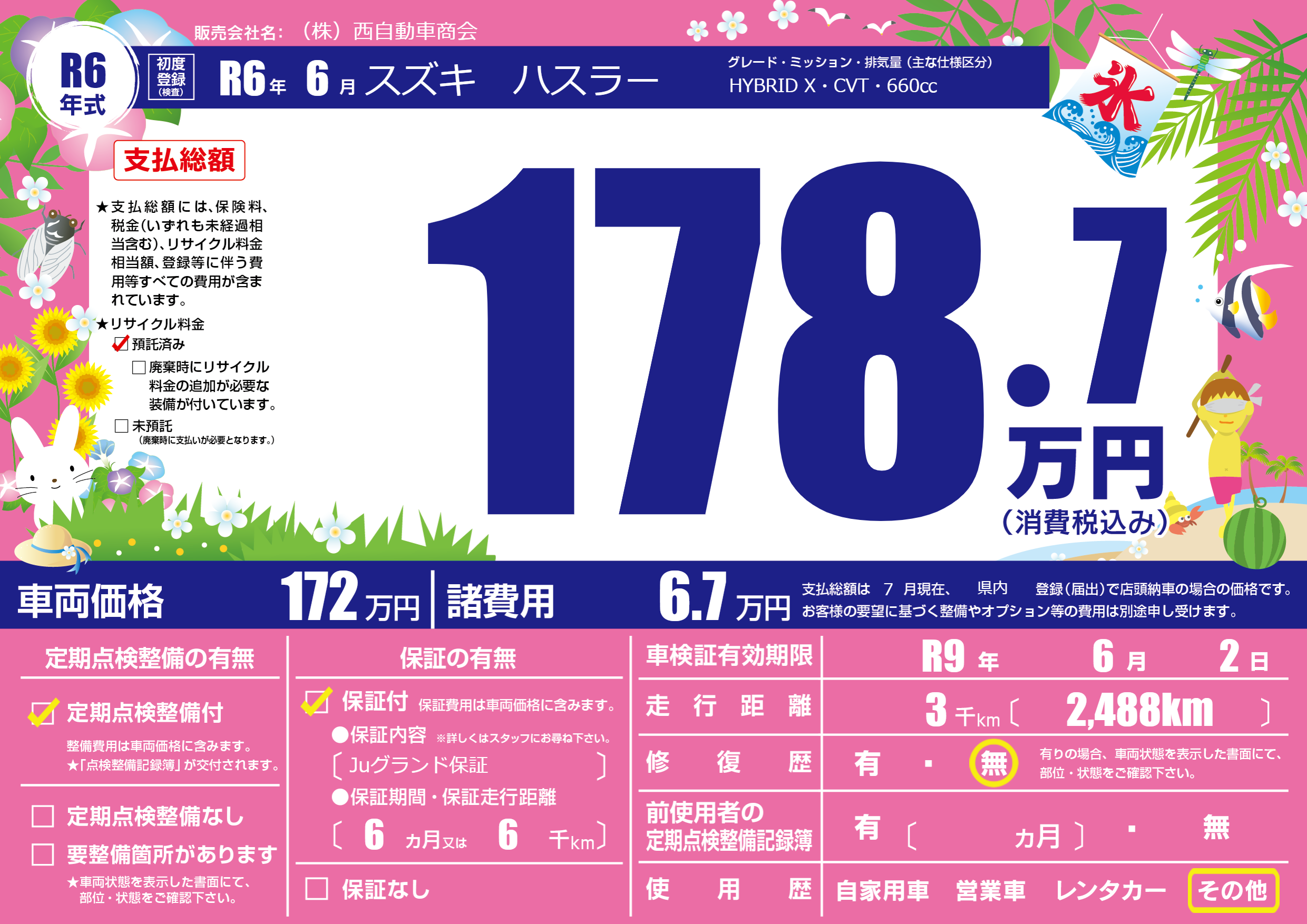 | 走行キロ | 0.3万km | 初年度登録 | R6年6月 |