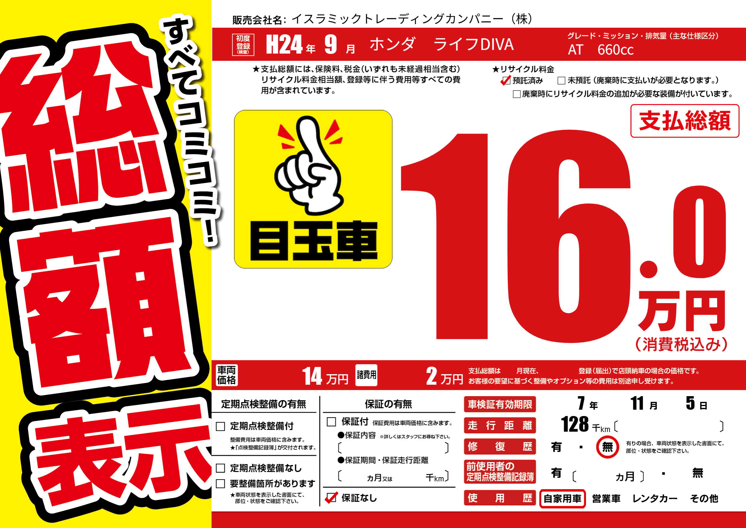 | 走行キロ | 12.8万km | 初年度登録 | H24年9月 |