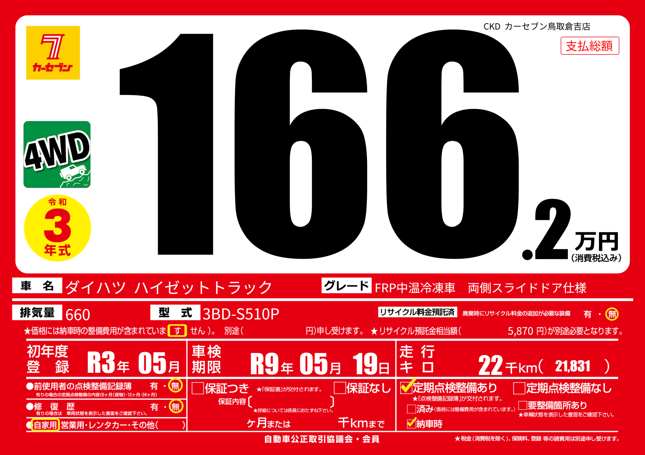 | 走行キロ | 2.2万km | 初年度登録 | R3年05月 |