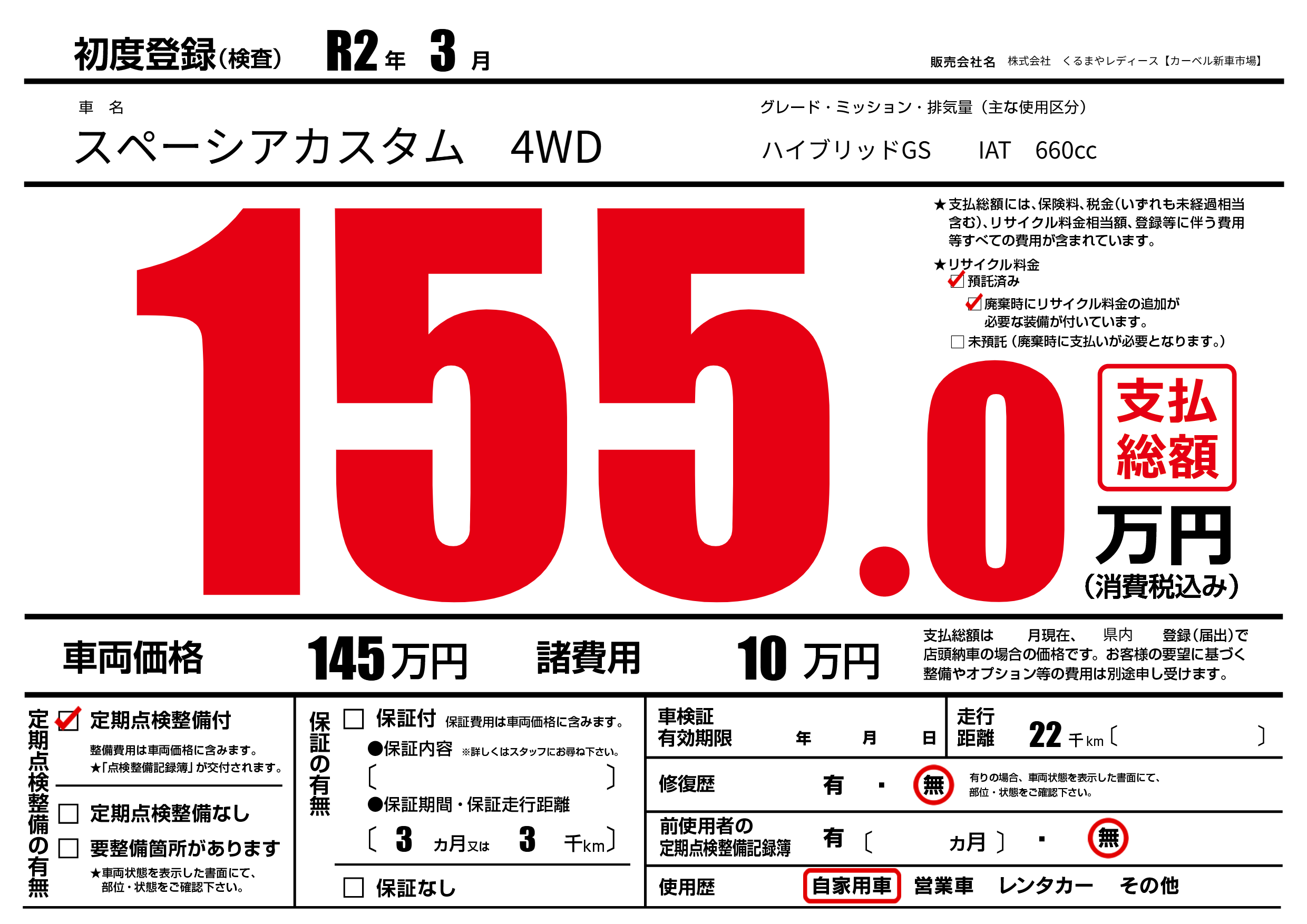 | 車名 | スペーシアカスタム 4WD | グレード ミッション 排気量 |