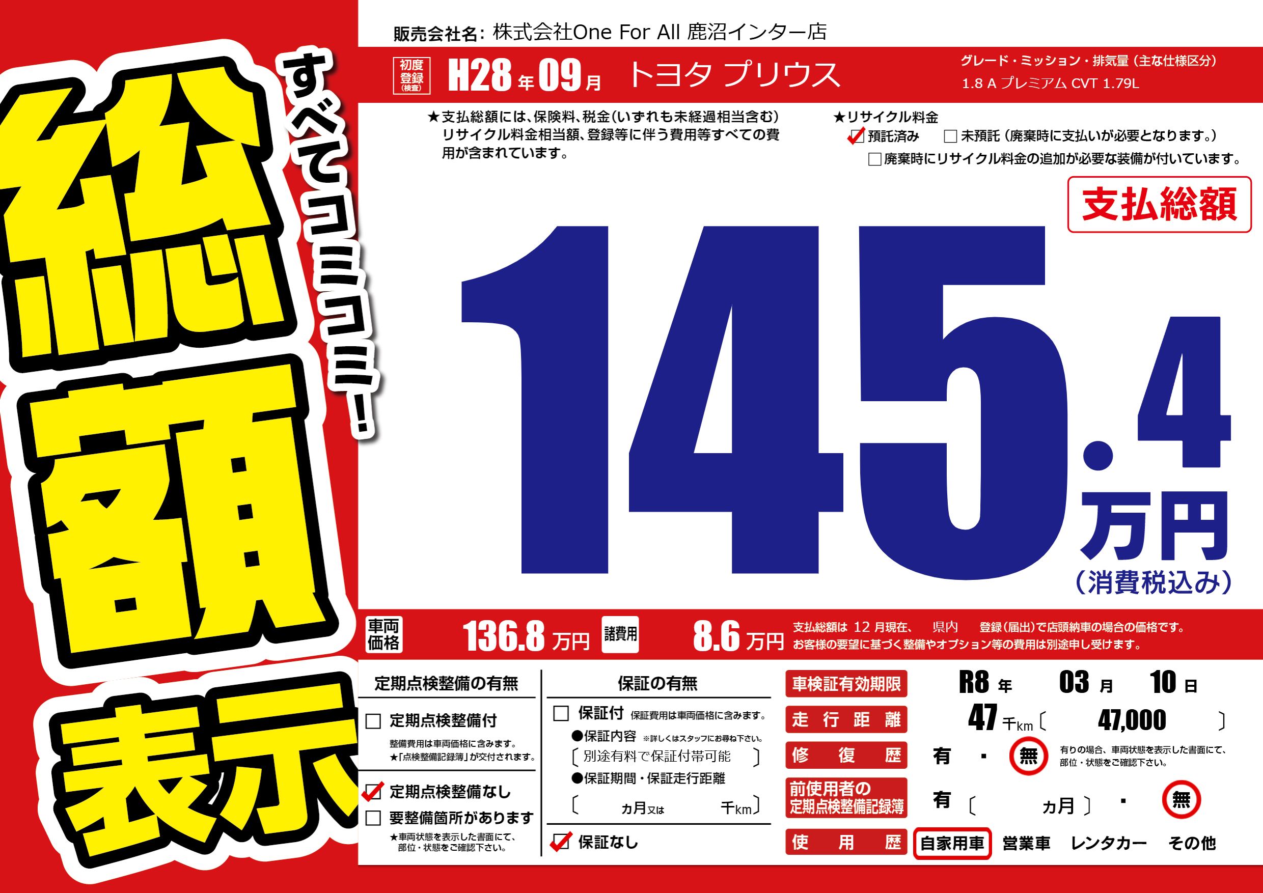 | 車名 | トヨタ プリウス | グレード ミッション 排気量 |