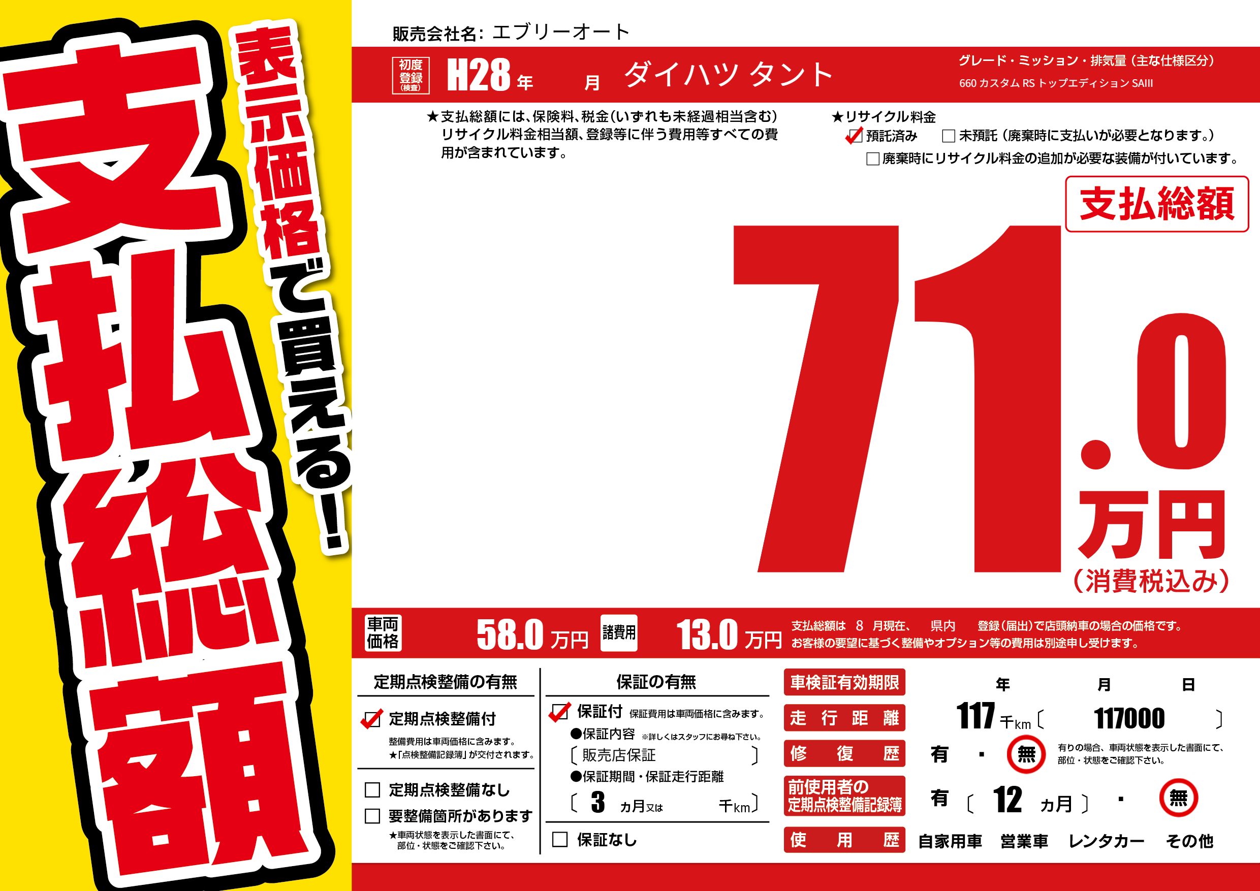 | 車名 | ダイハツ タント | グレード ミッション 排気量 |
