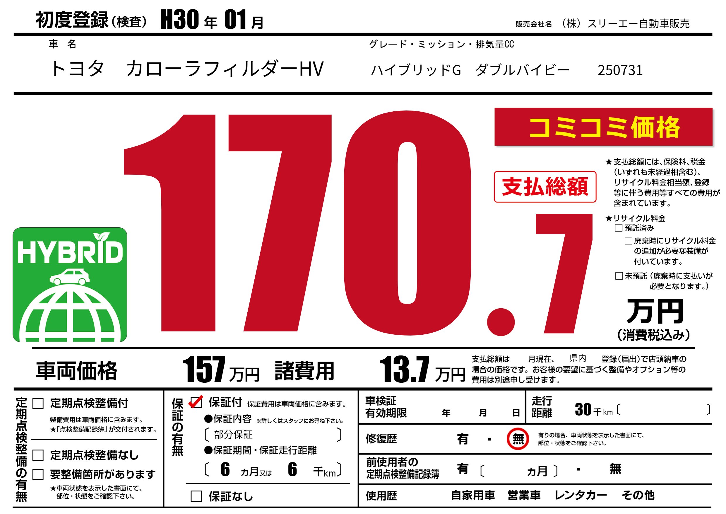 | 車名 | トヨタ カローラフィルダーHV | グレード ミッション 排気量 |