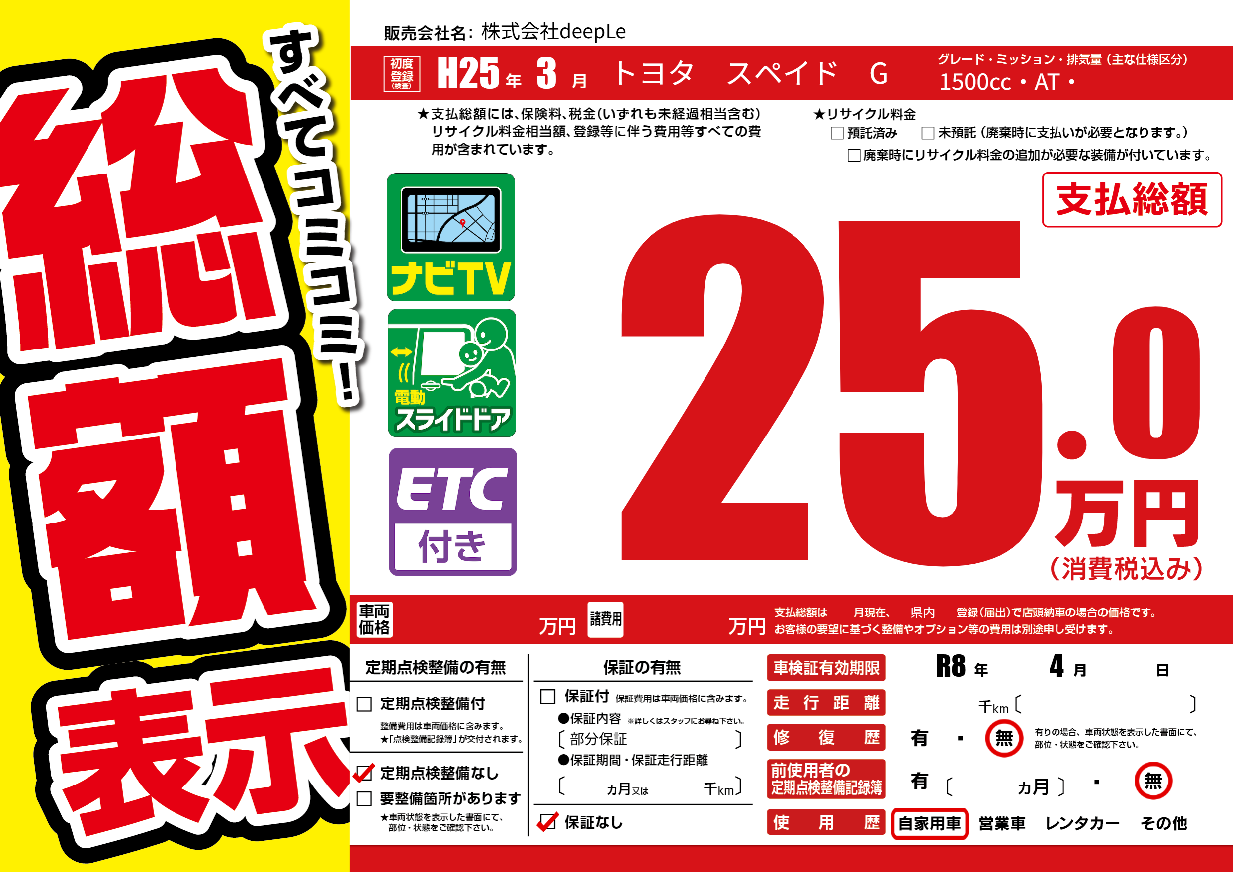 | 車名 | トヨタ スペイド G | グレード ミッション 排気量 |