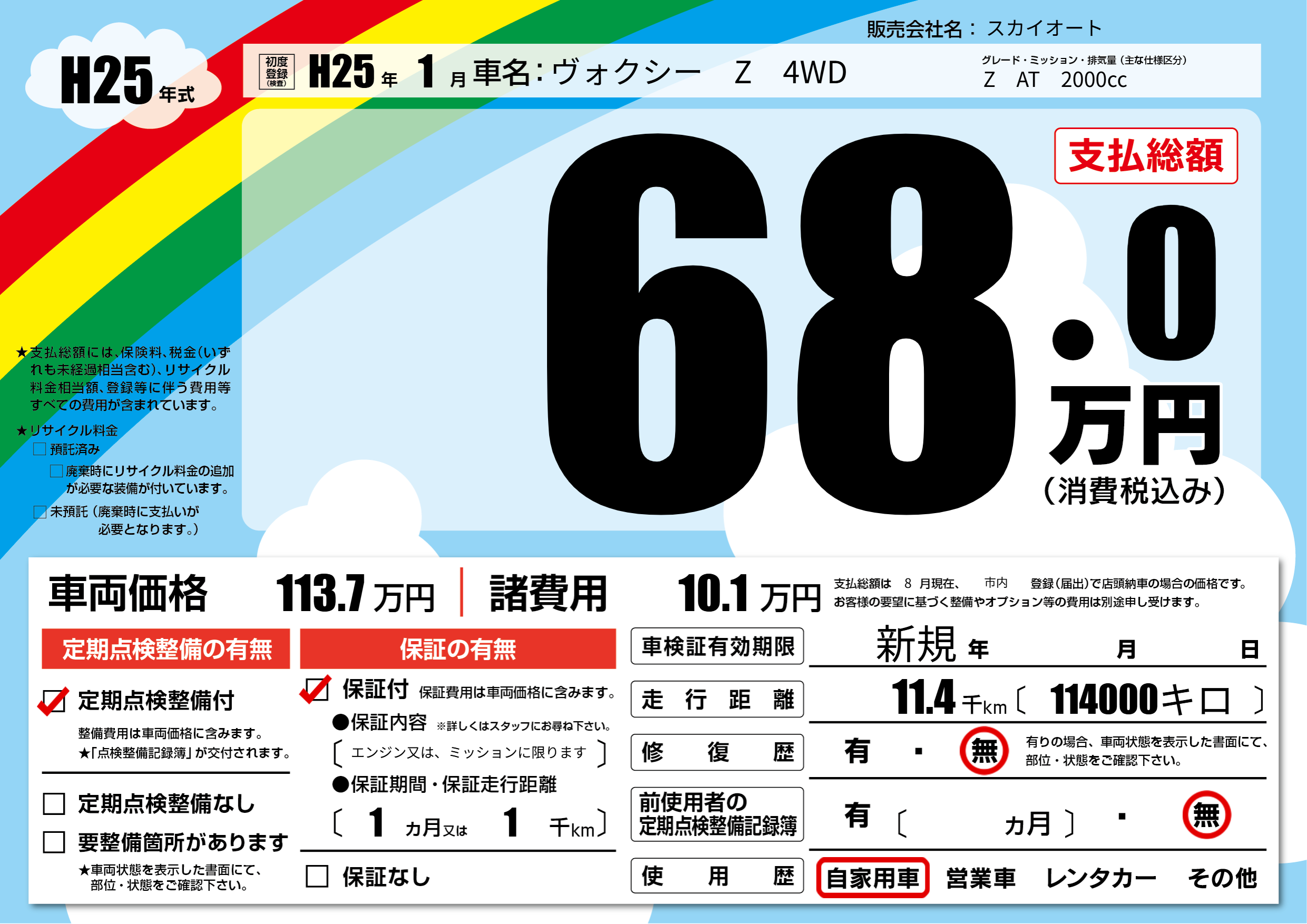 | 車名 | ヴォクシー Z 4WD | グレード ミッション 排気量 |