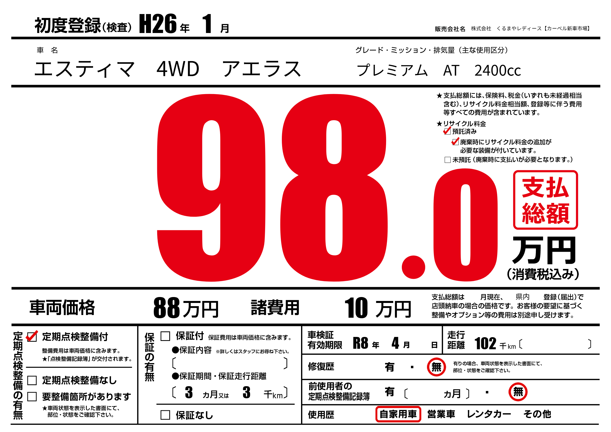| 車検制限 | R8年 4月 - 日 | ||