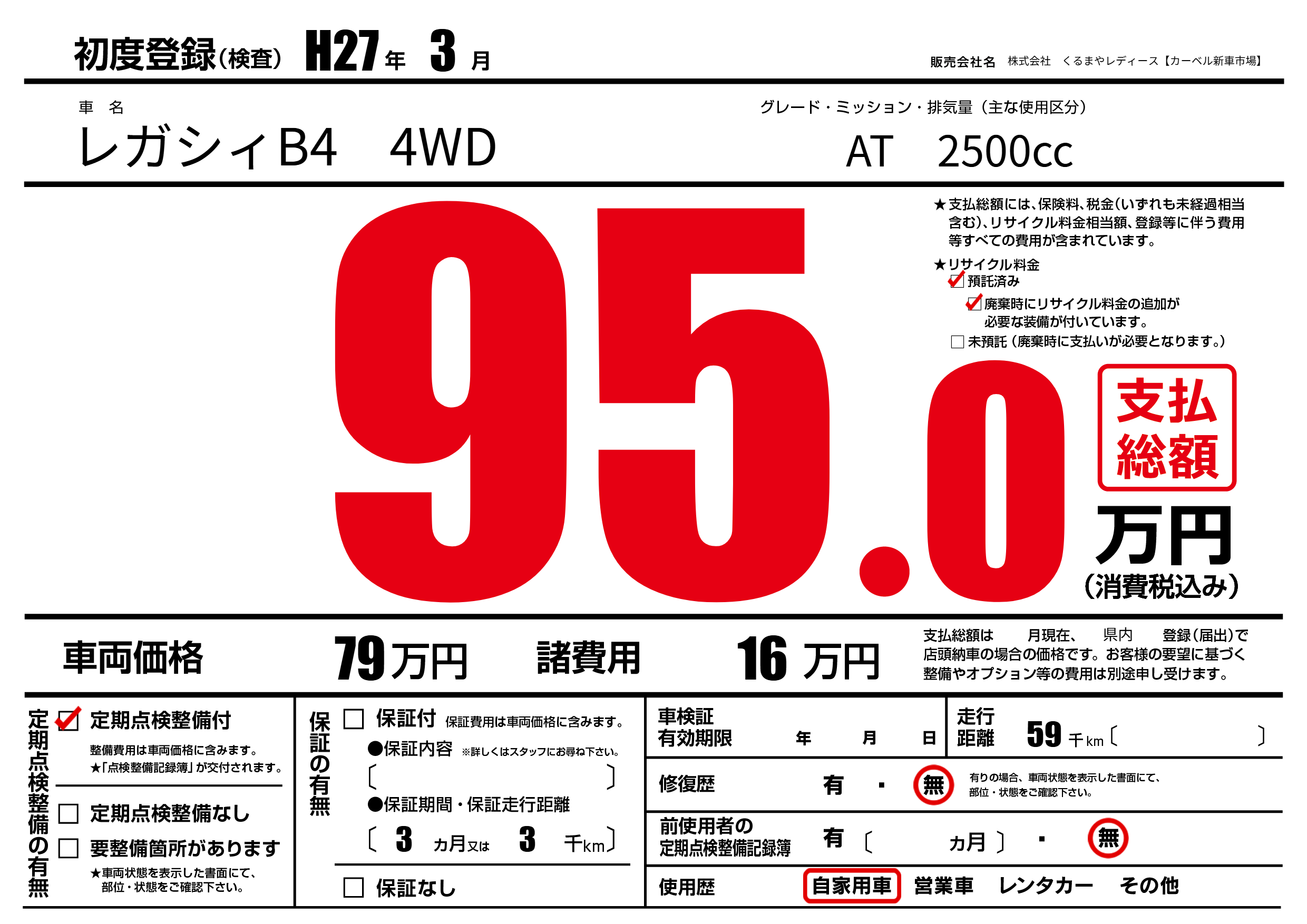 | 車名 | レガシィB4 4WD | グレード ミッション 排気量 |