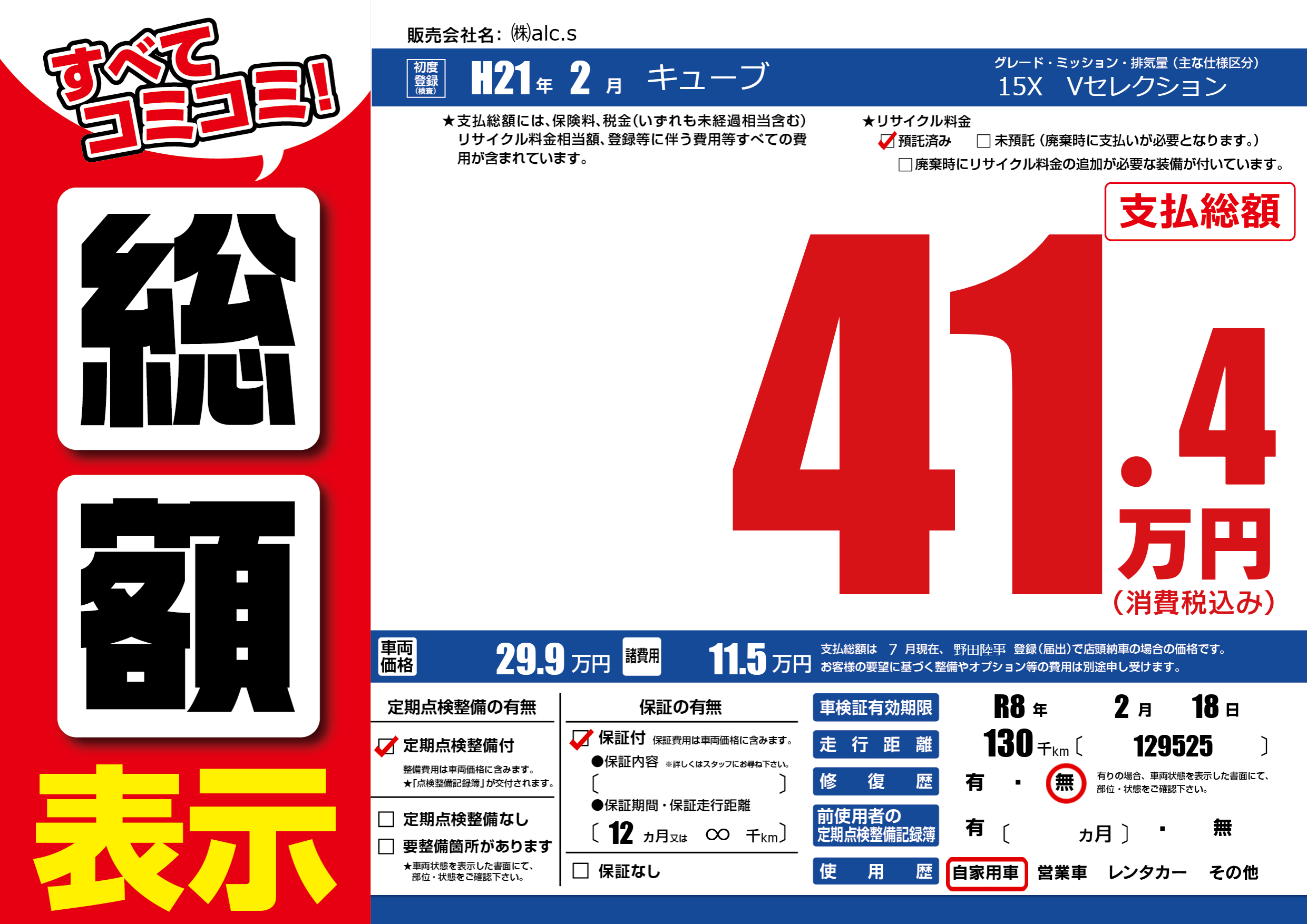 | 走行キロ | 13万km | 初年度登録 | H21年2月 |