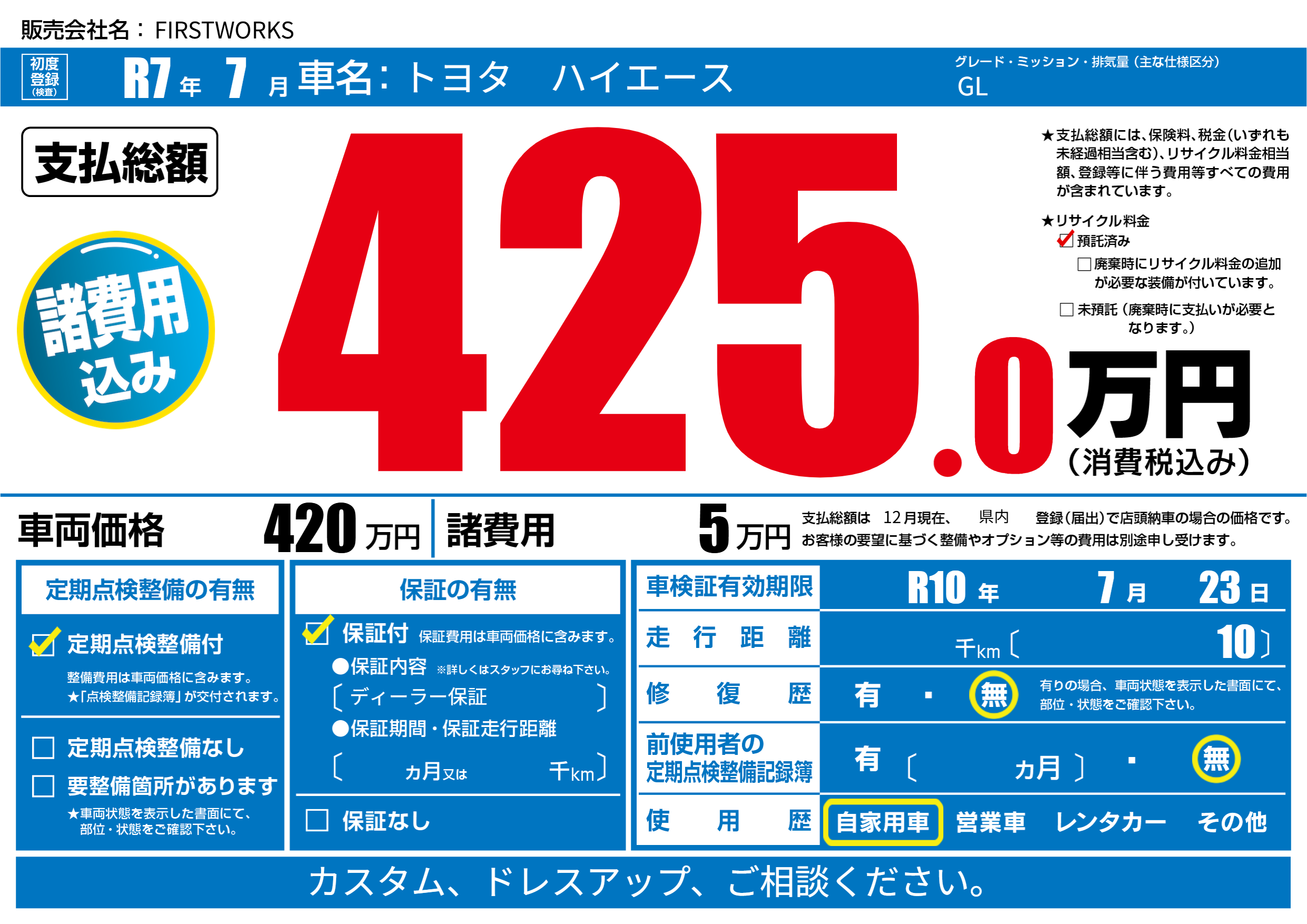 | 走行キロ | - | 初年度登録 | R7年7月 |