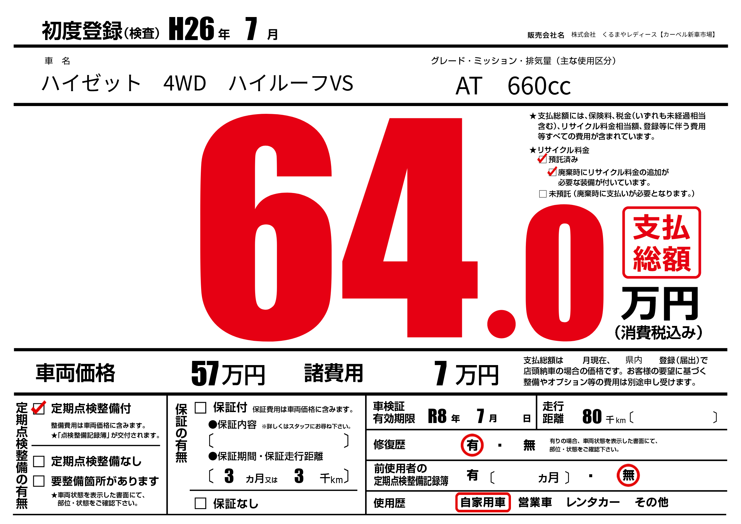 | 走行キロ | 8万km | 初年度登録 | H26年7月 |