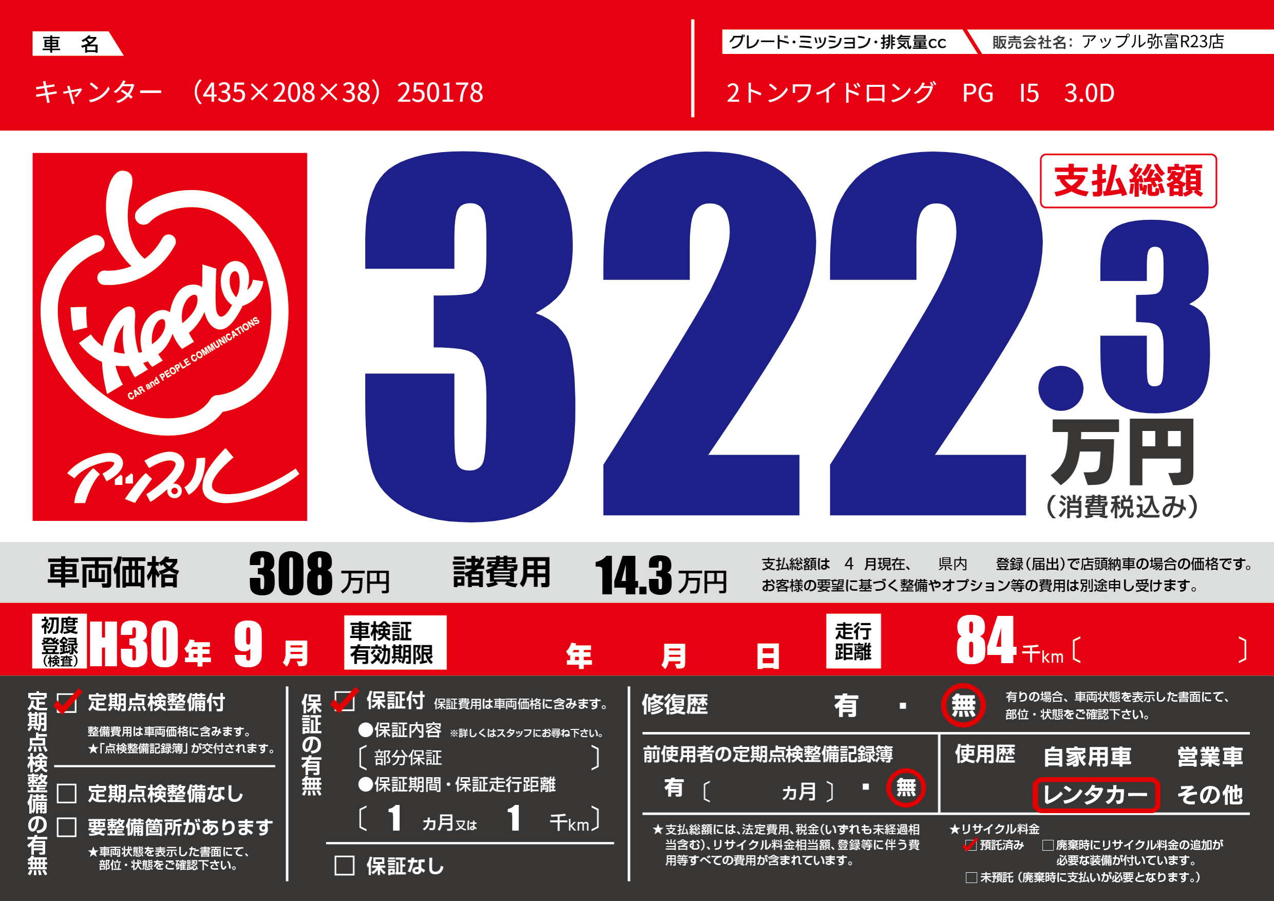 | 車名 | キャンター (435×208×38)250178 | グレード ミッション 排気量 |