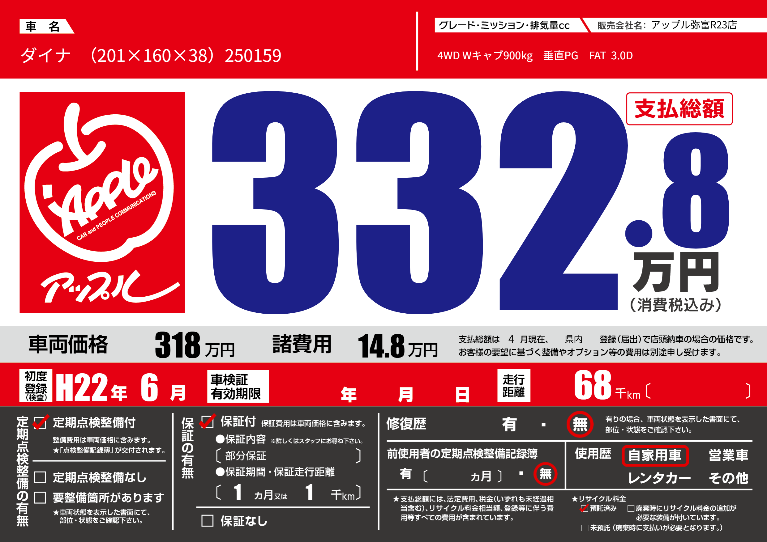 | 車名 | ダイナ (201×160×38)250159 | グレード ミッション 排気量 |