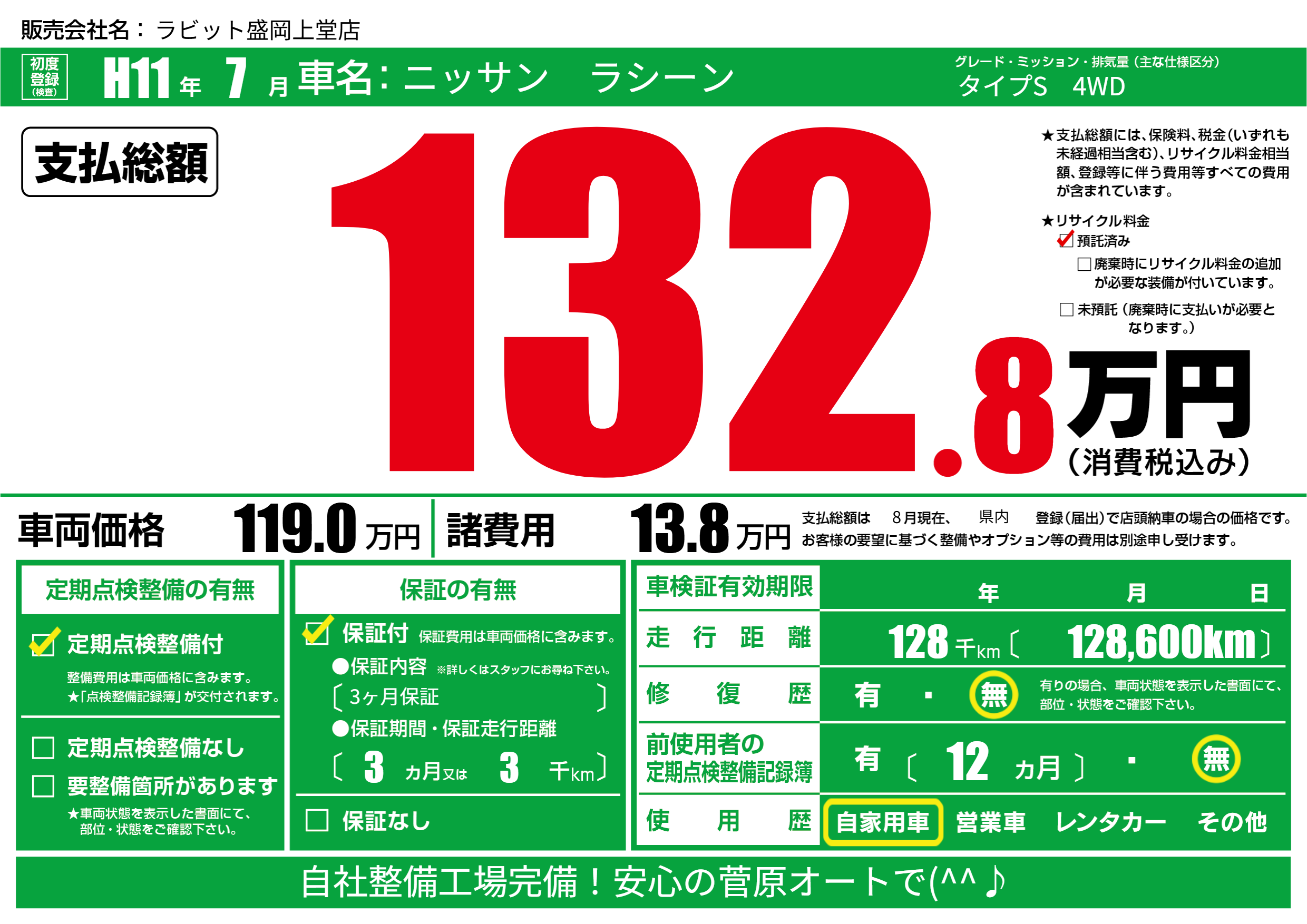 | 走行キロ | 12.8万km | 初年度登録 | H11年7月 |