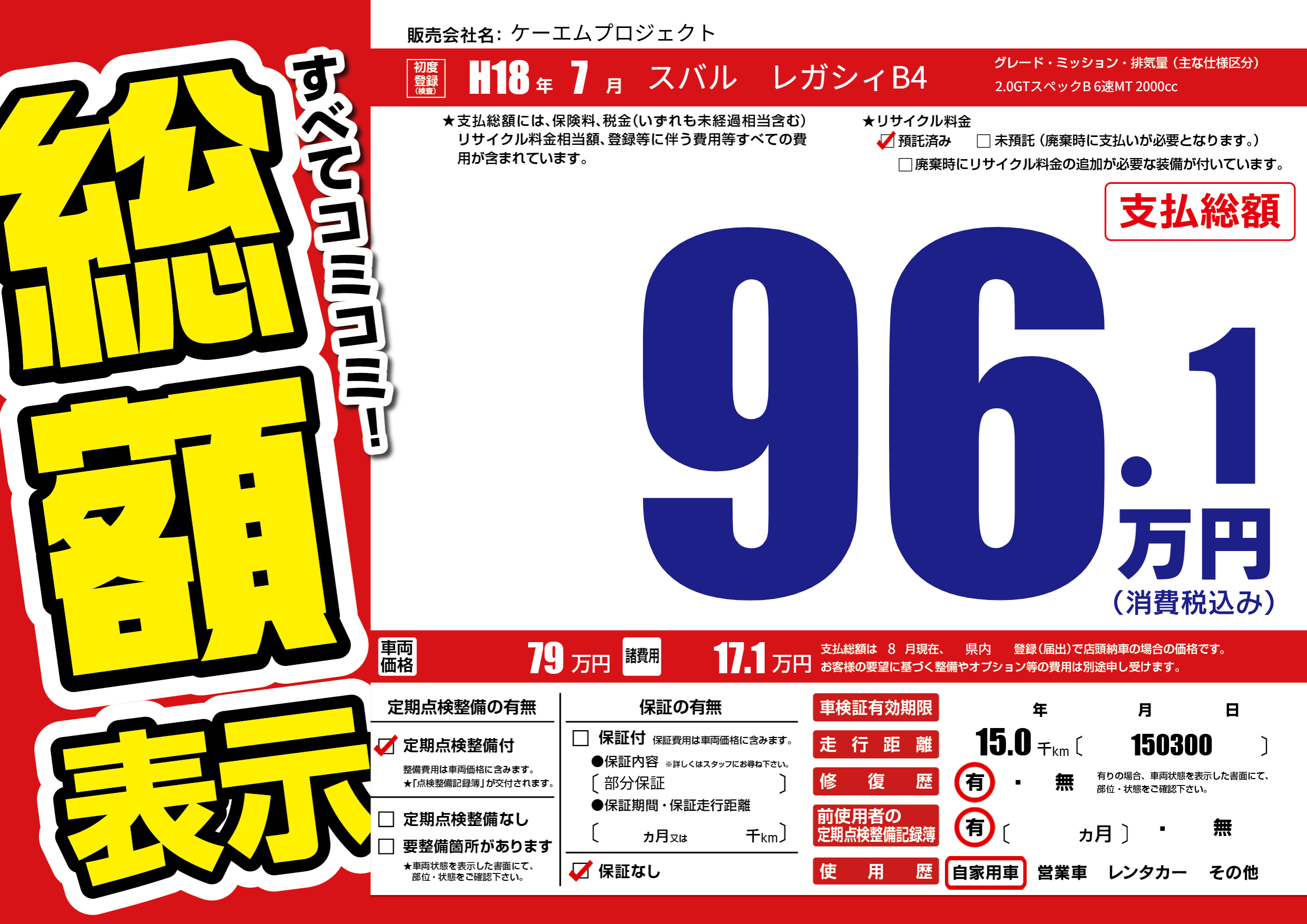| 車名 | スバル レガシィB4 | グレード ミッション 排気量 |