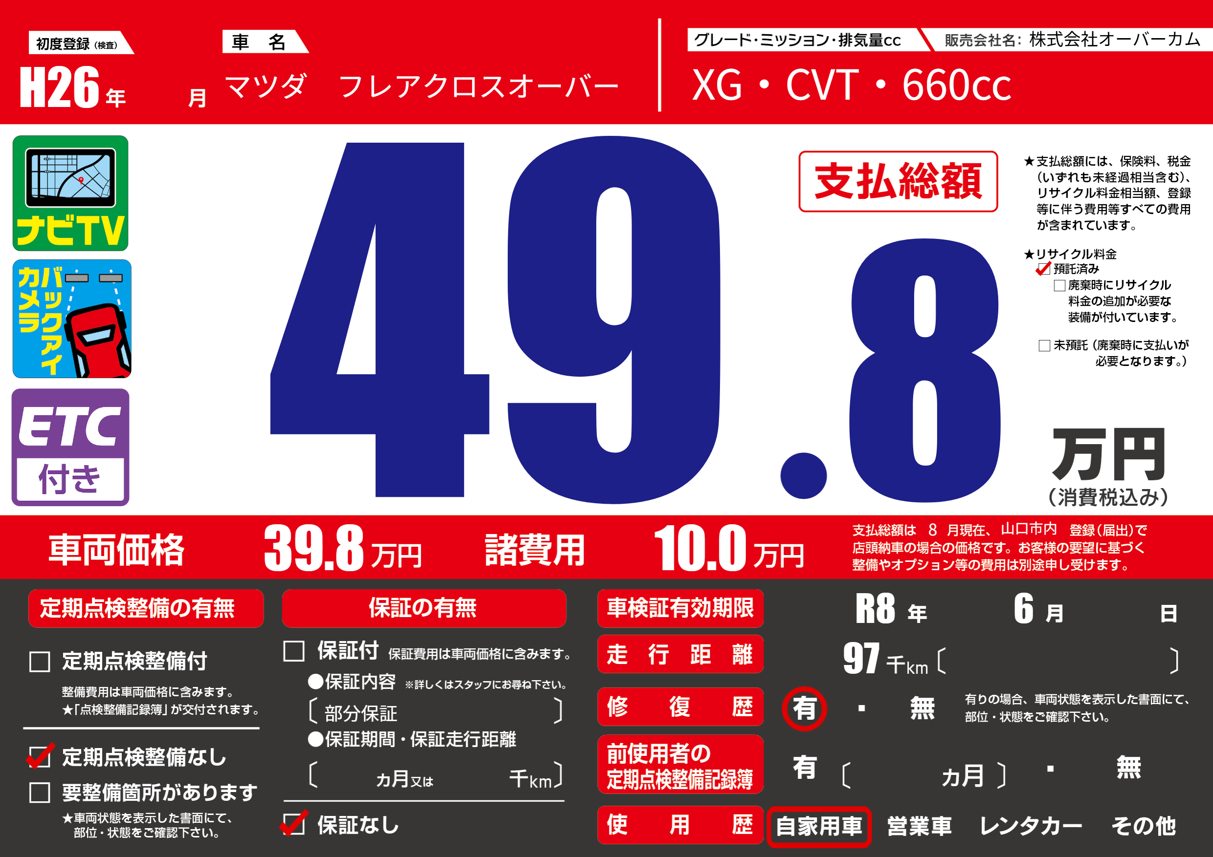 | 走行キロ | 9.7万km | 初年度登録 | H26年---月 |