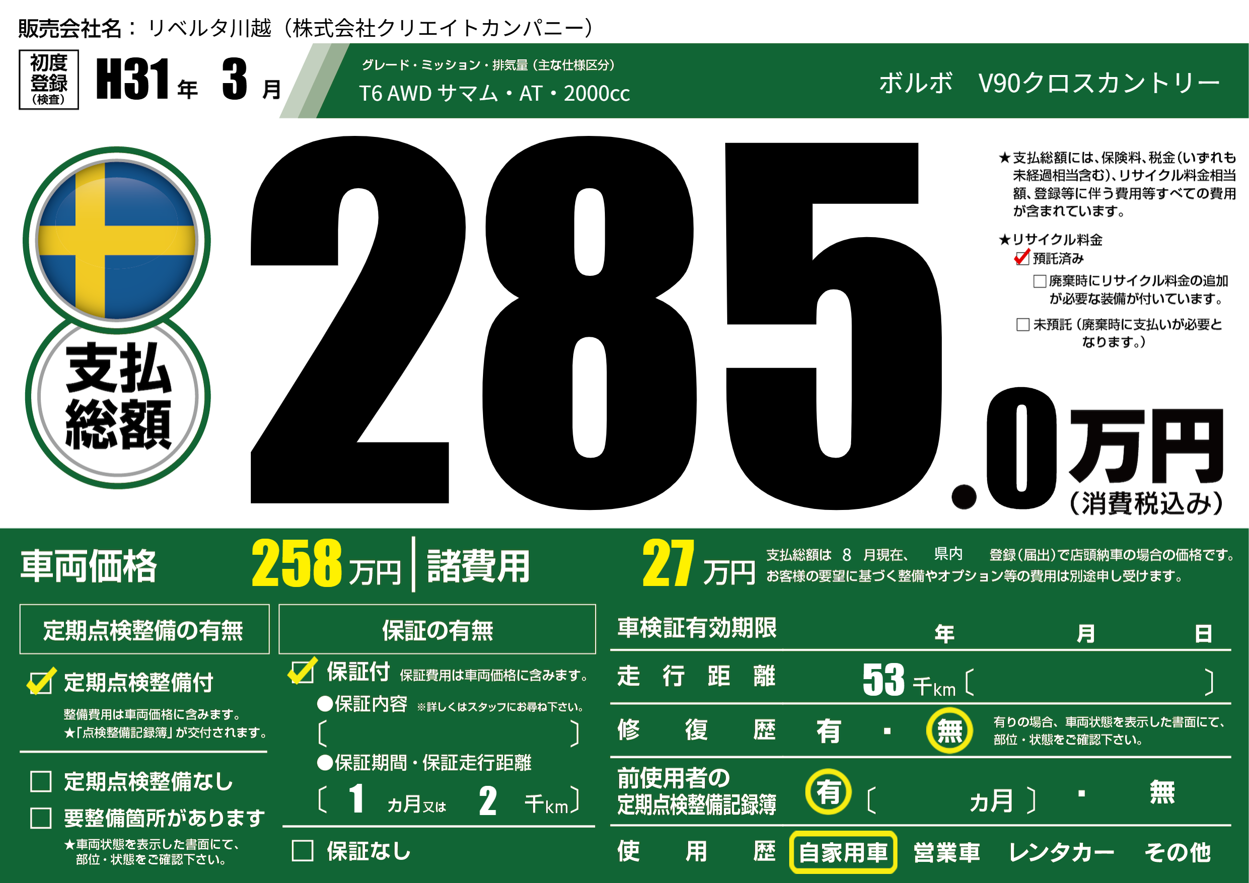 | 車名 | ボルボ V90クロスカントリー | グレード ミッション 排気量 |