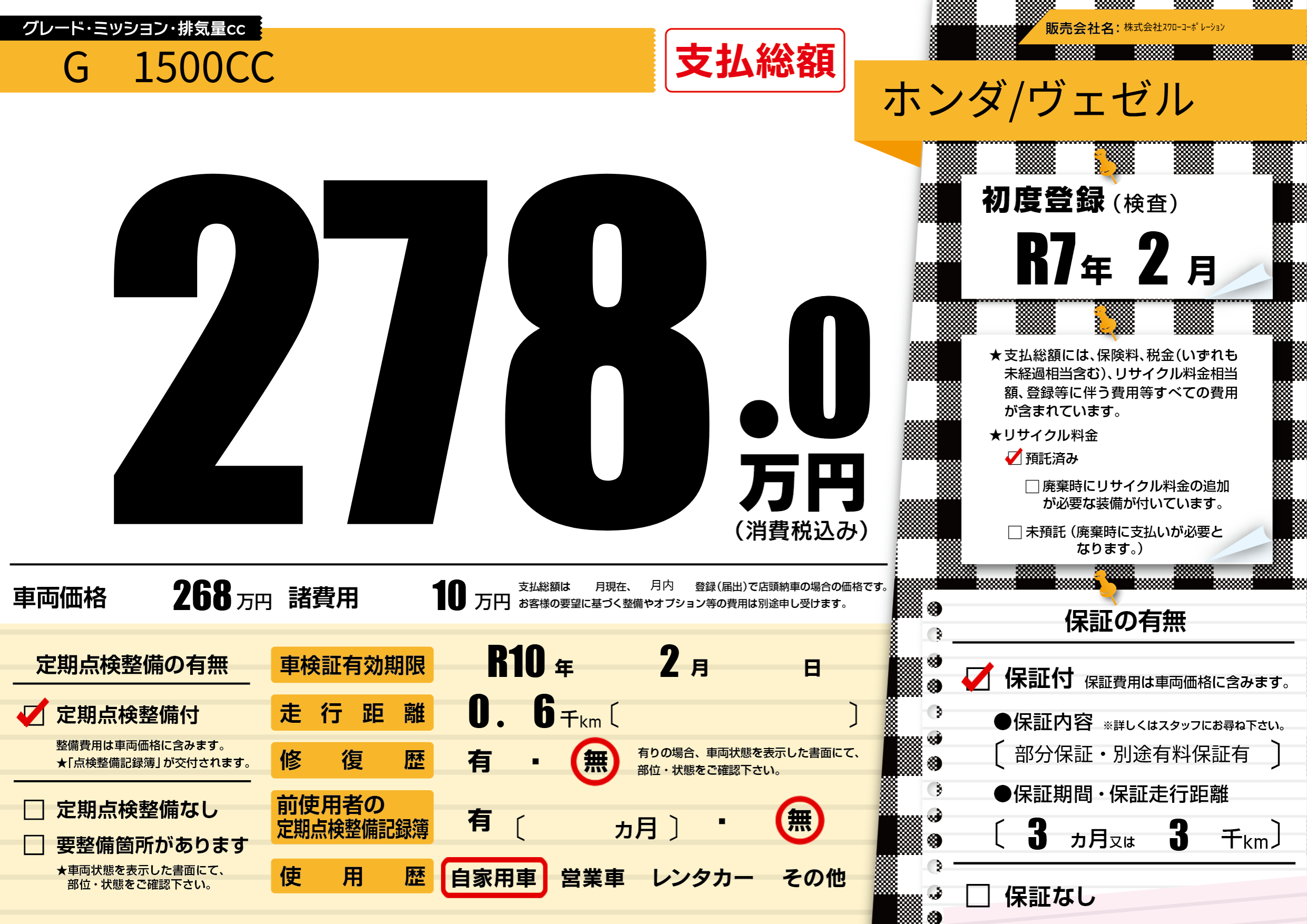 | 車名 | ホンダ/ヴェゼル | グレード ミッション 排気量 |