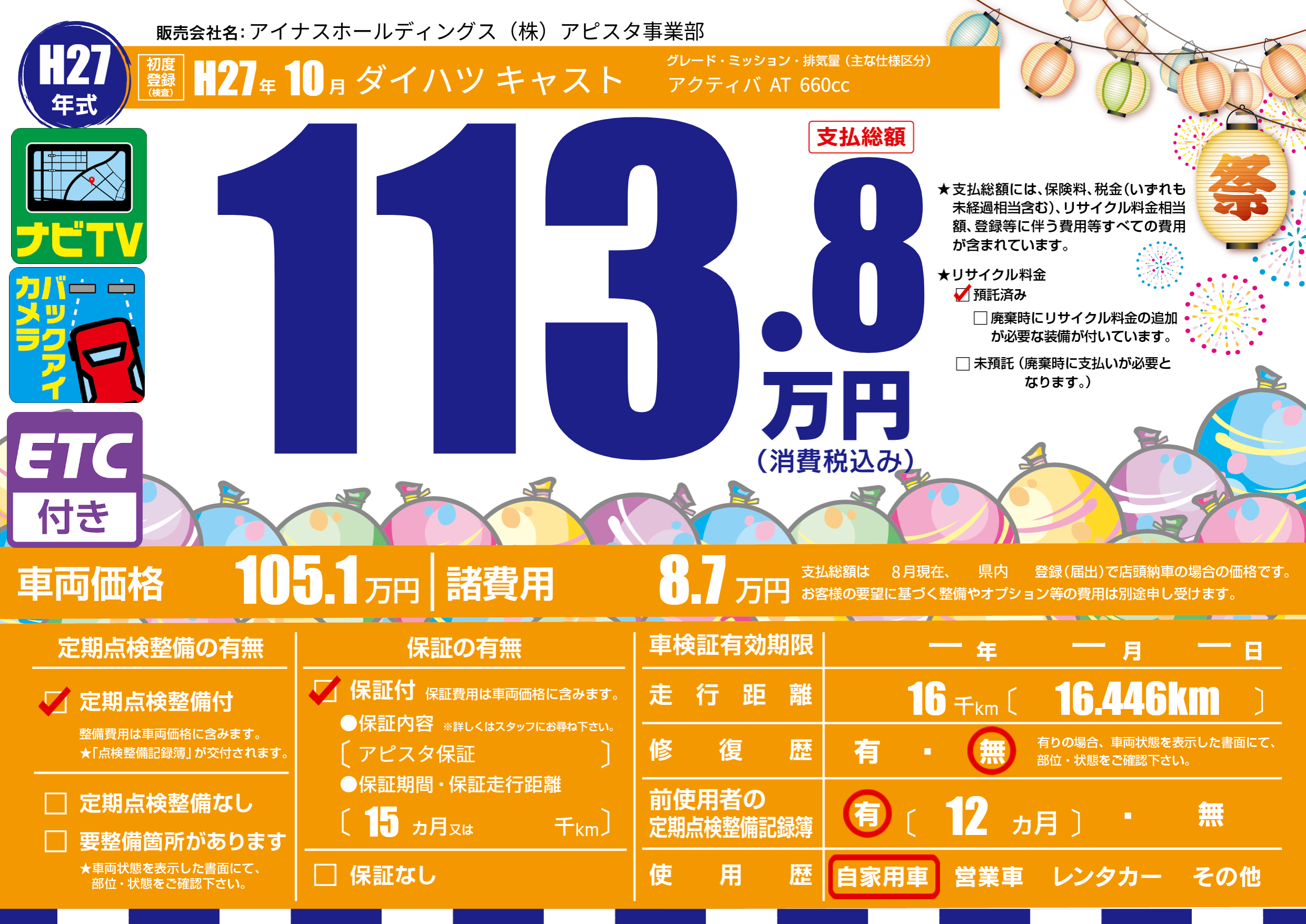 保証付き 保証内容(アピスタ保証) 15ヶ月または()千kmまで |