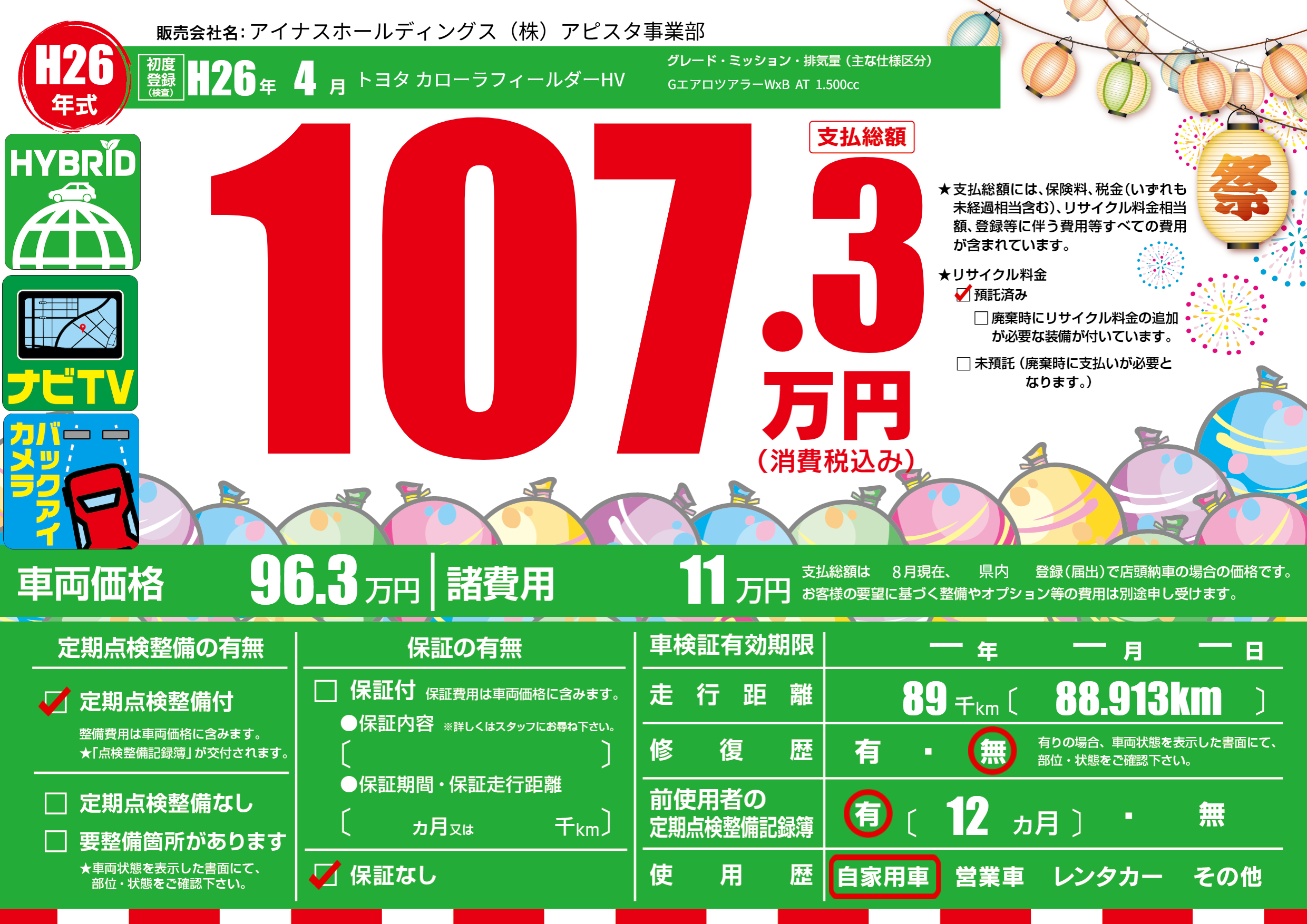 | 走行キロ | 8.9万km | 初年度登録 | H26年4月 |