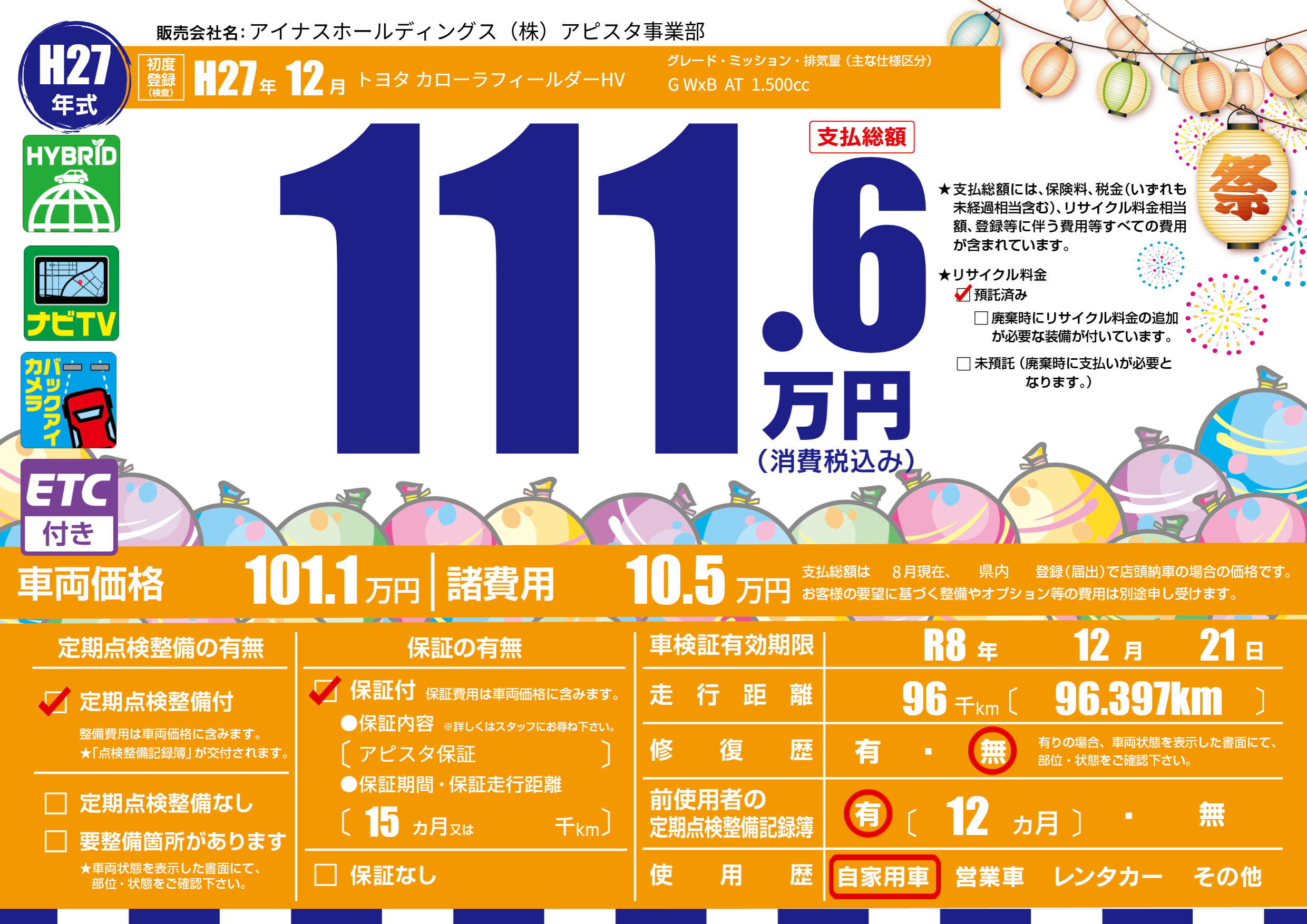 | 走行キロ | 9.6万km | 初年度登録 | H27年12月 |