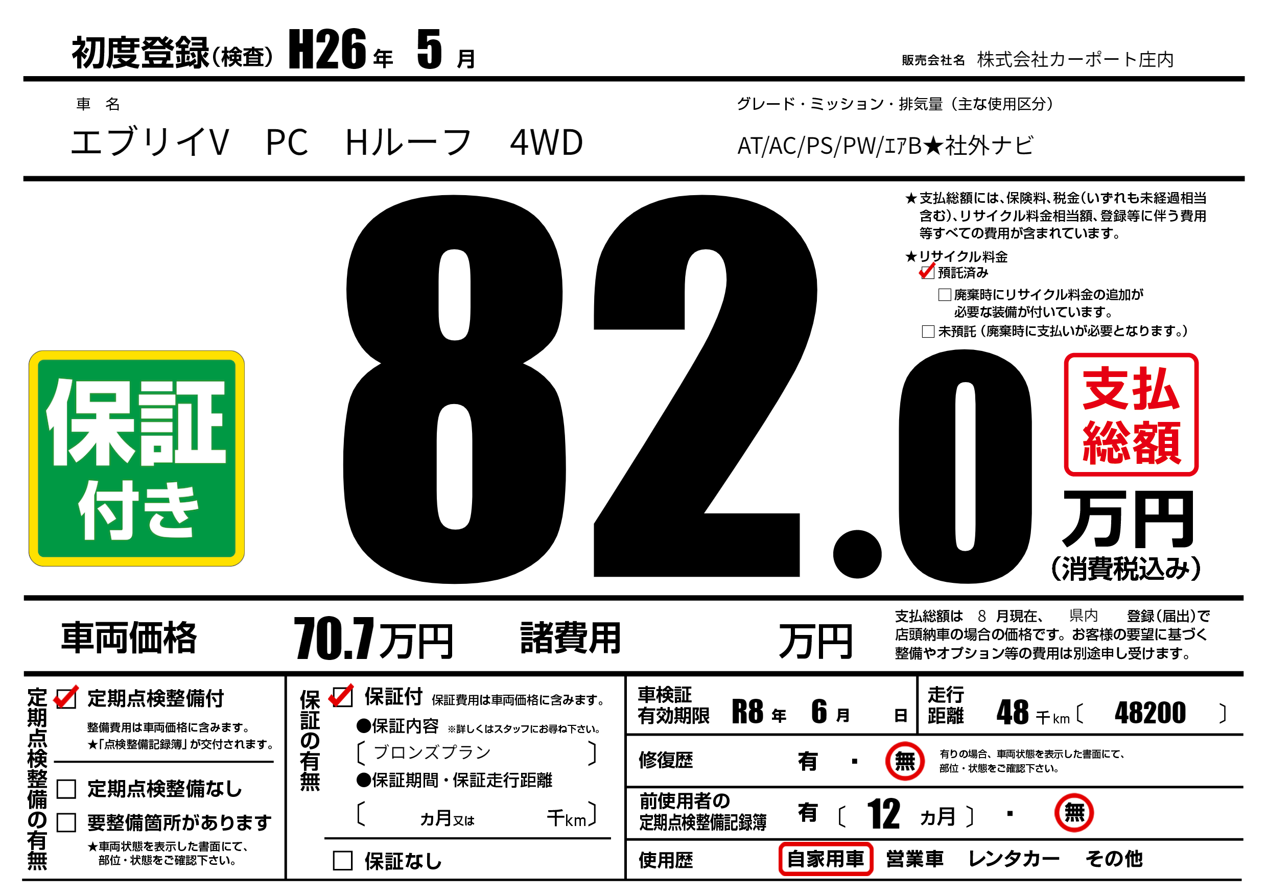 | 車名 | エブリイV PC Hルーフ 4WD | グレード ミッション 排気量 |