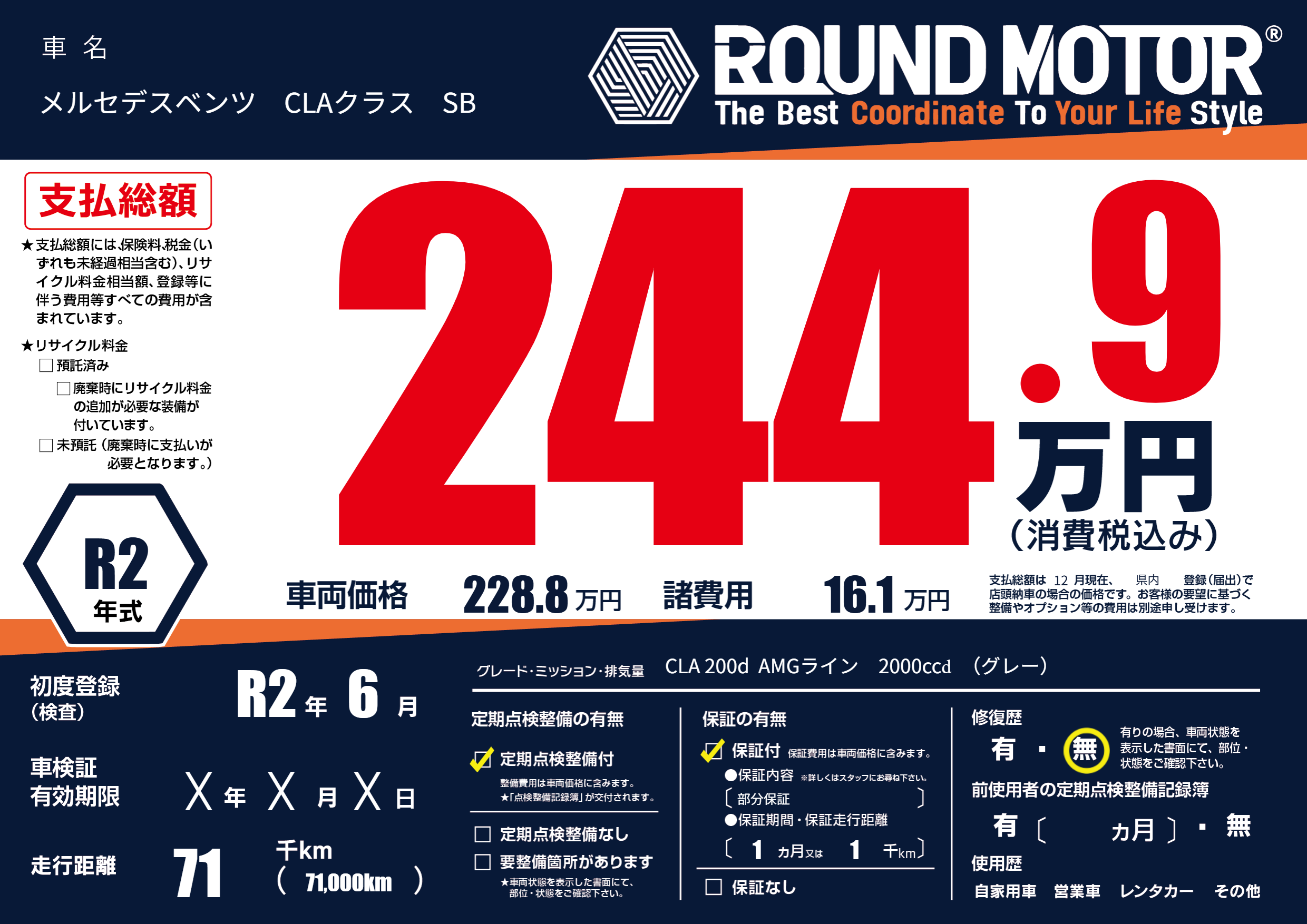 | 車名 | メルセデスベンツ CLAクラス SB | グレード ミッション 排気量 |