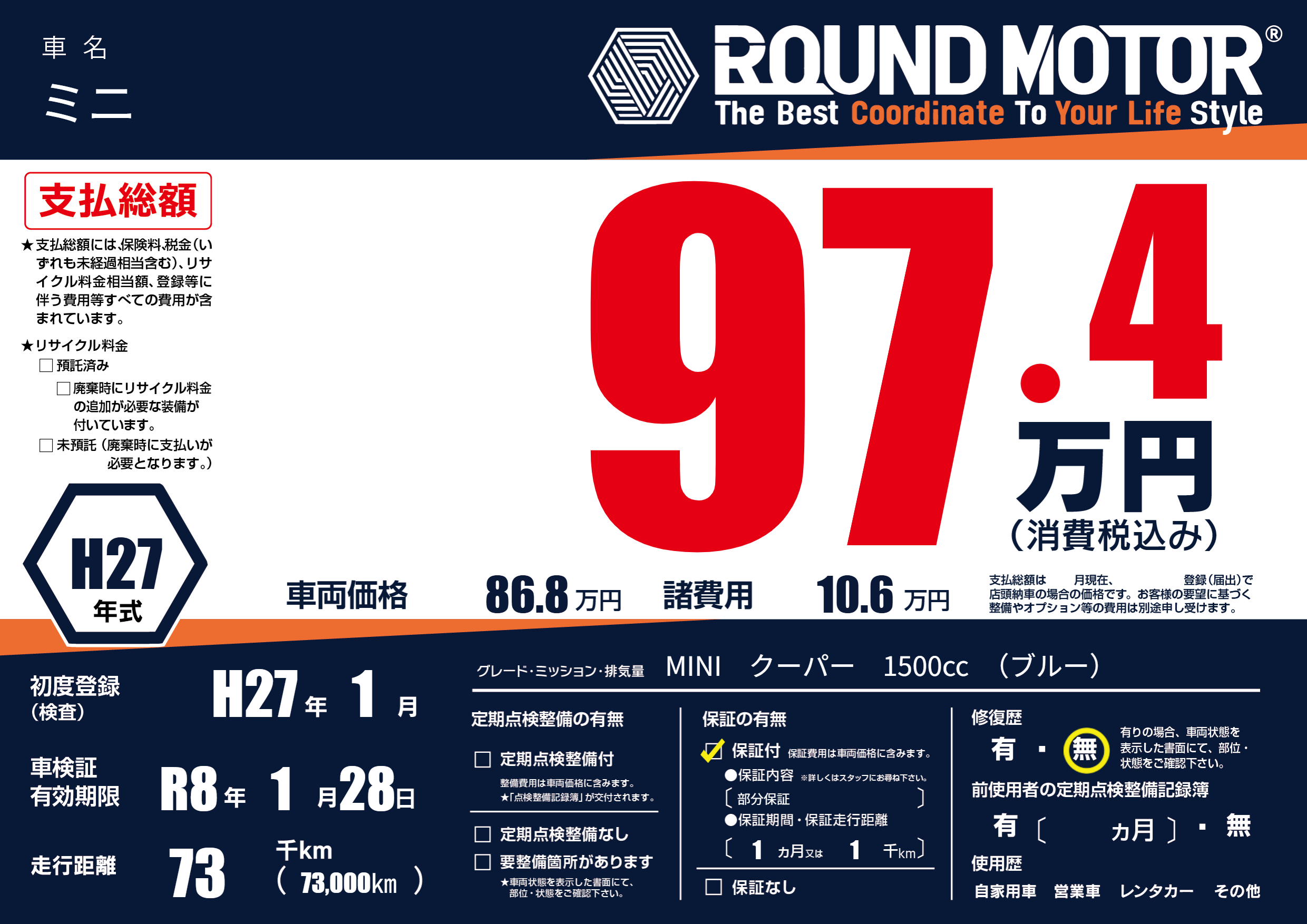 | 車名 | ミニ | グレード ミッション 排気量 |