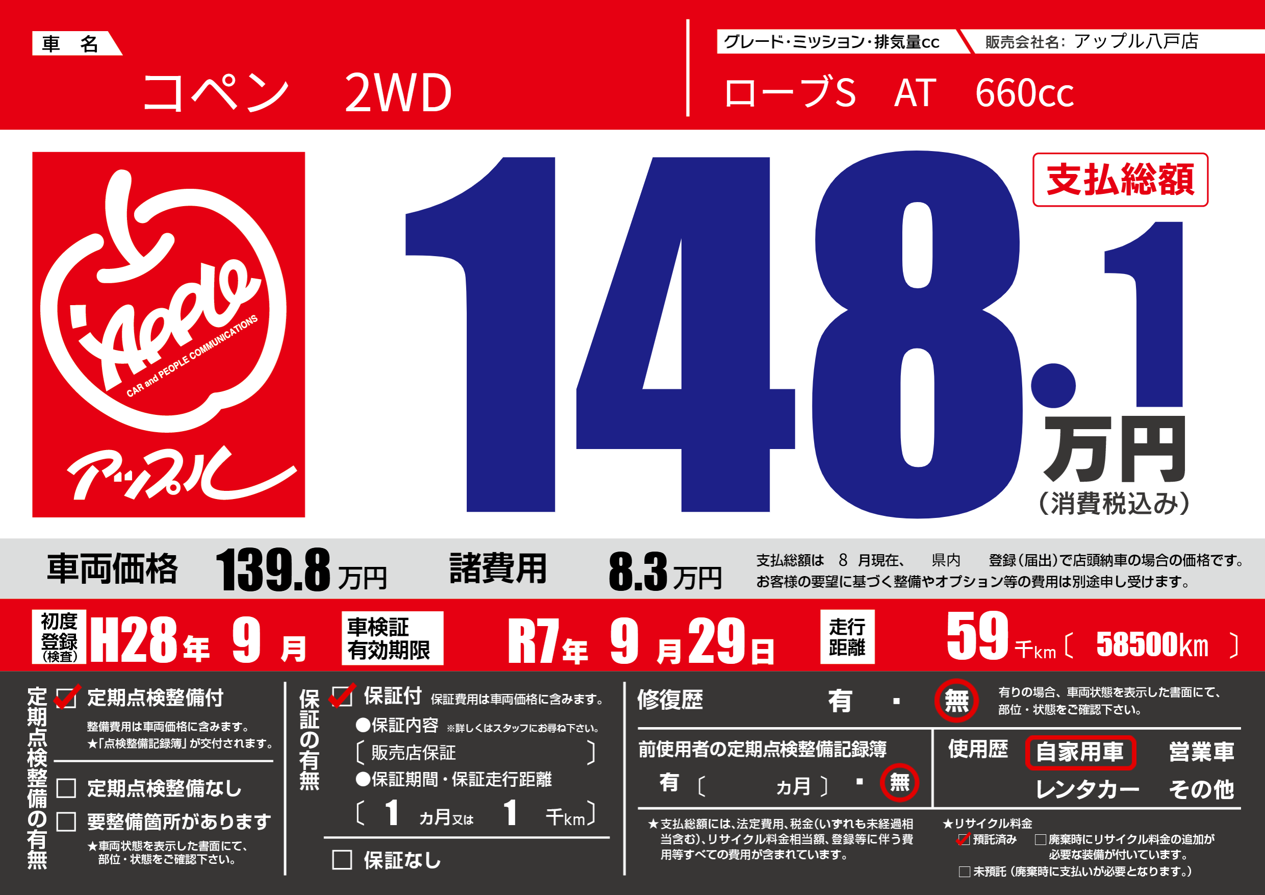 | 車名 | コペン 2WD | グレード ミッション 排気量 |